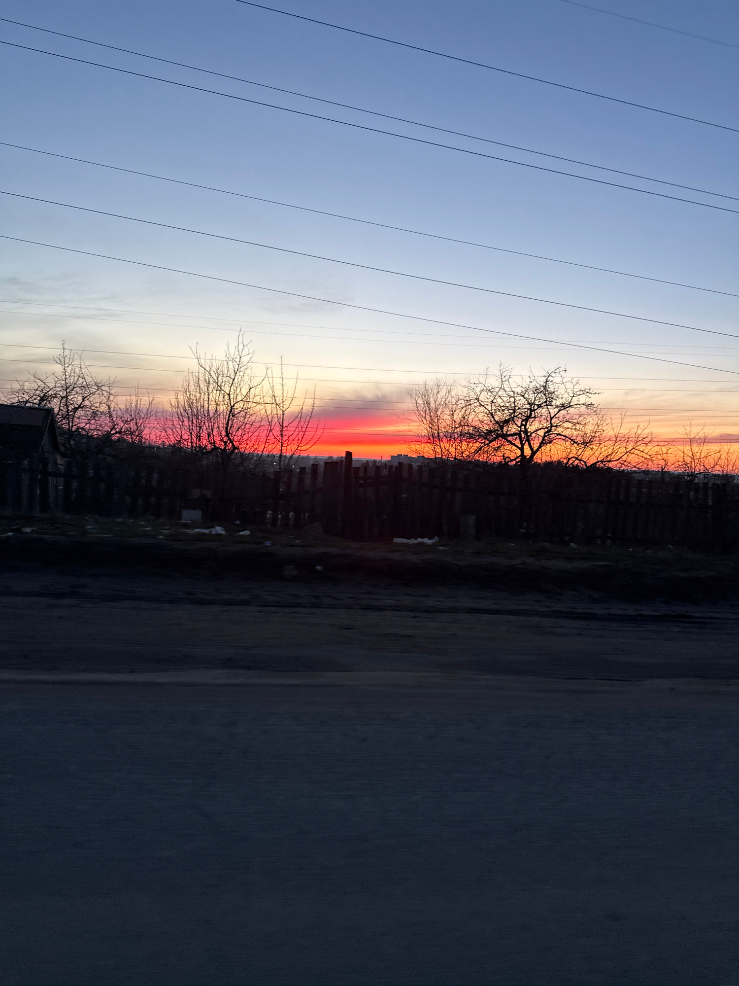 The image shows a sunset in Chaikovsky, Russia. Power lines stretch across the left side of the frame, against a pale blue and orange sky. Silhouetted trees and a wooden fence run horizontally across…read more