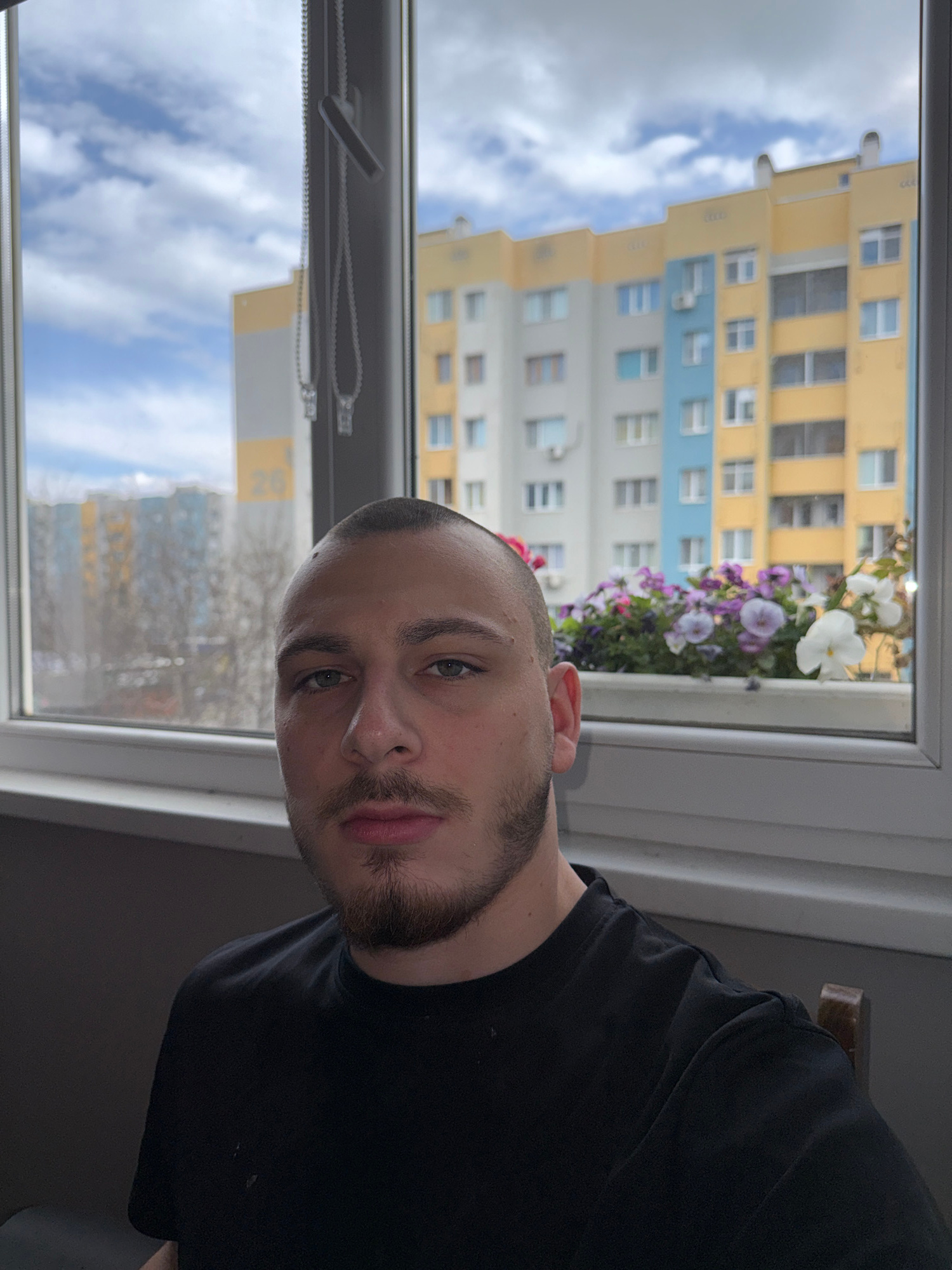 A man with a shaved head and a beard is standing in front of a window. The window is open and there are flowers growing on the windowsill. Outside the window, there is a tall building with yellow, blu…read more