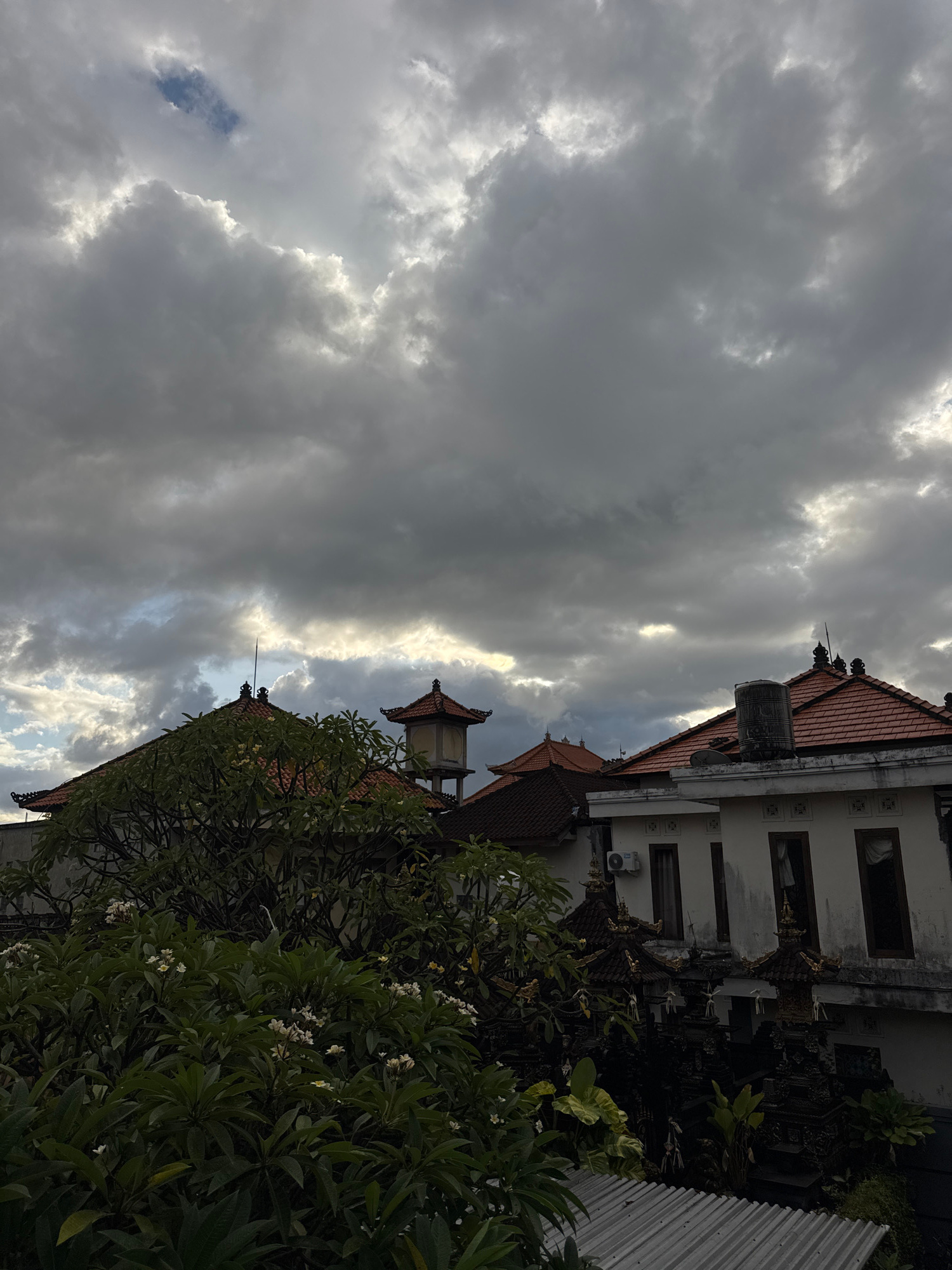 The image, when properly oriented, presents an outdoor scene featuring traditional Balinese-style buildings nestled amidst lush tropical vegetation under a dramatic, overcast sky. The setting is Kuta,…read more