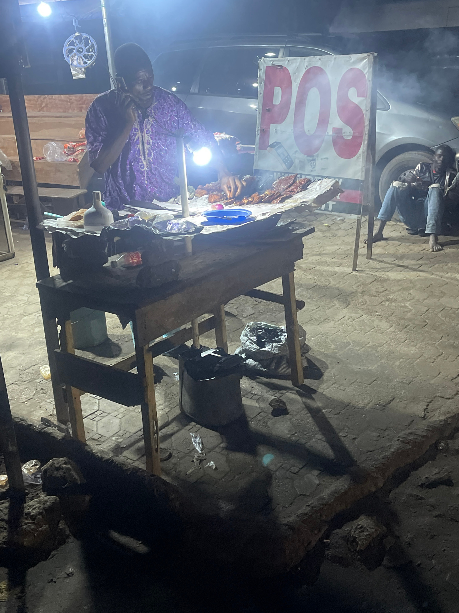 The image depicts a nighttime scene in Abraka, Nigeria, featuring a street vendor operating a roadside grill. The vendor, a man wearing a purple patterned shirt, is seen on the left side of the frame, seemingly on a phone call. He stands behind a makeshift wooden table displaying grilled meat. A POS (Point of Sale) sign is visible above the table. A white car is partially visible in the background, and a second person can be seen near the car. Debris and litter are scattered around the base of the grill stand and on the pavement. The street is dimly lit, with shadows cast by the grill and the table. The ground is paved with interlocking concrete blocks. | Open Wire