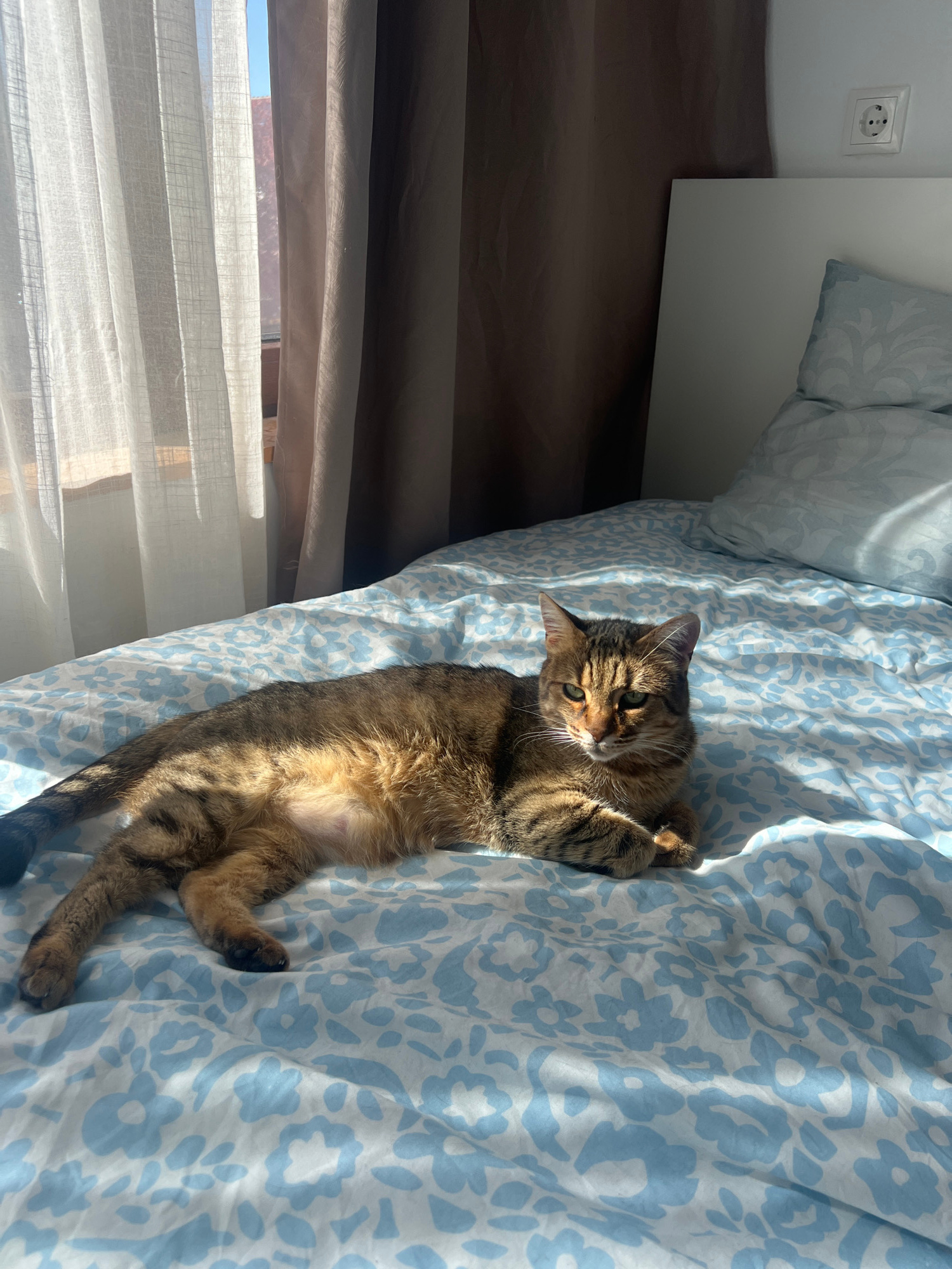 A medium-sized brown tabby cat is lying on its back on a bed covered with a blue and white floral patterned duvet. The cat is oriented diagonally across the frame, with its head at the top and its tai…read more