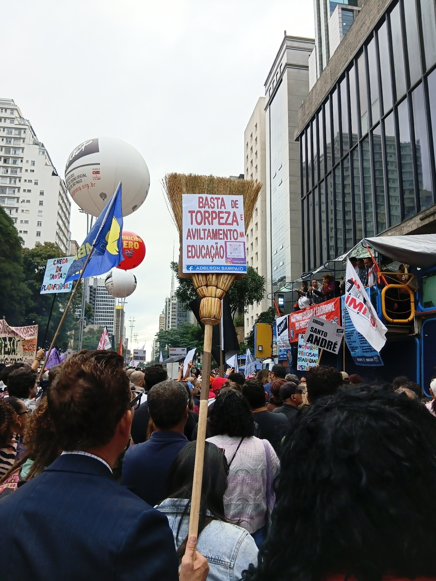 The image shows a protest in São Paulo, Brazil. A large crowd of people fills the street, holding signs and banners. One sign, topped with a broom, reads "BASTA DE TORPEZA E AVILTAMENTO NA EDUCAÇÃO" (…read more