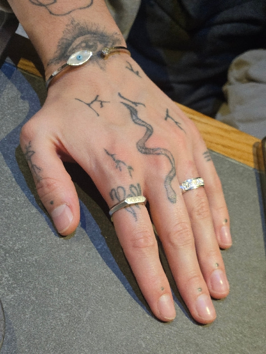 A person's hand rests on a surface, adorned with tattoos and jewelry. A silver bracelet with a blue and white center sits on the wrist, below a sun-like tattoo. A snake tattoo curves across the top of…read more
