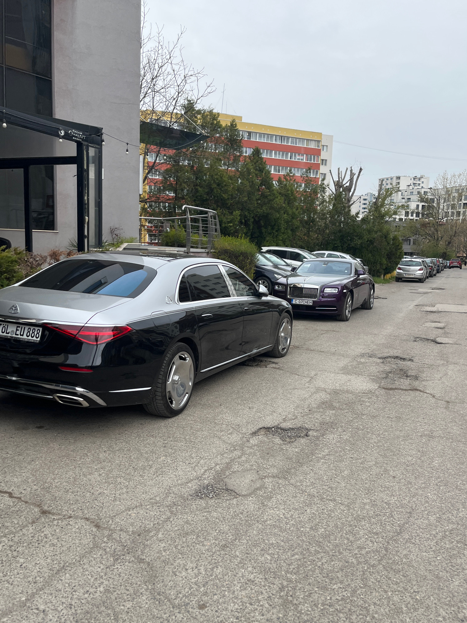 The image shows a street scene in an urban area. The main focus is on a line of parked luxury cars, including a black and silver Maybach and a purple Rolls Royce. The cars are parked on a narrow streeβ¦read more