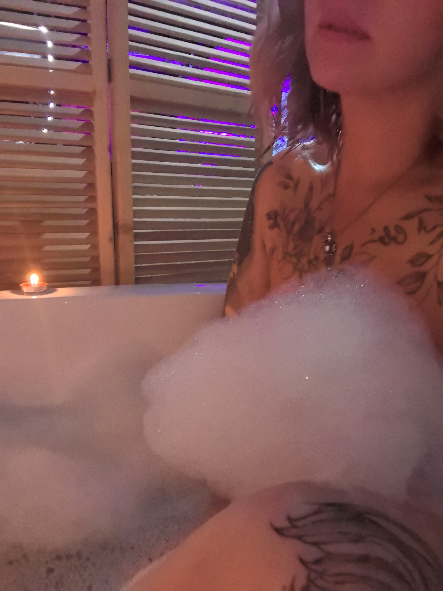 A woman with tattoos is partially visible in a bubble bath. A candle is lit on the edge of the tub. The background features a wooden, louvered screen lit with purple lighting. The city of Noviy, Russi…read more