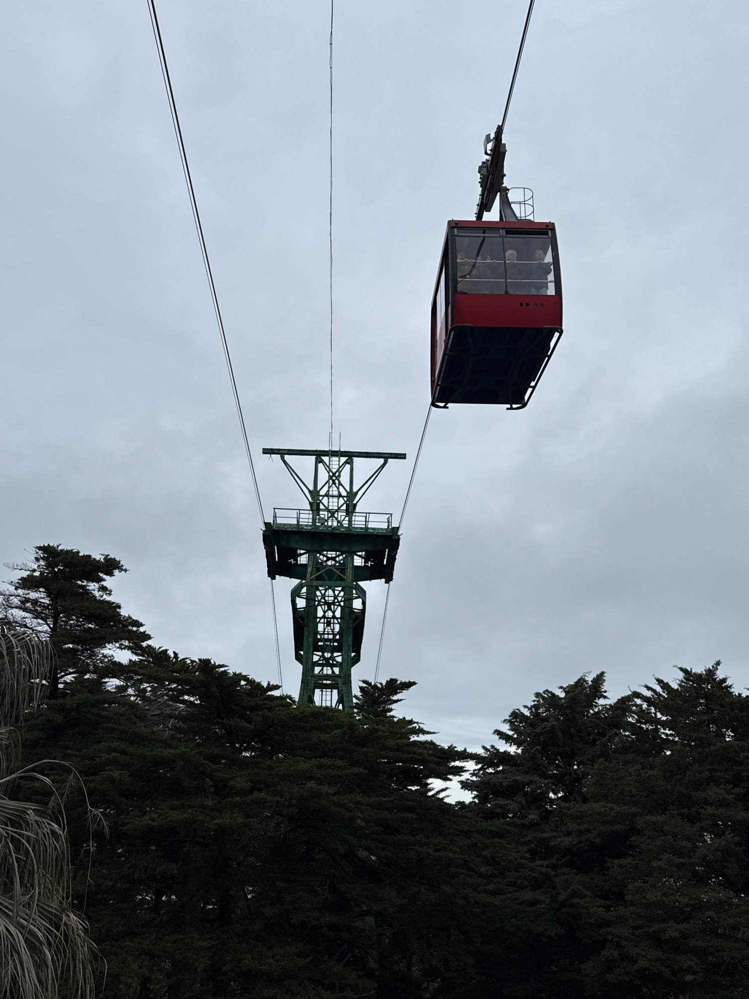 This image captures a red cable car gondola suspended by a black cable against an overcast, light gray sky. The rectangular gondola, featuring multiple windows, shows at least three blurred human figu…read more