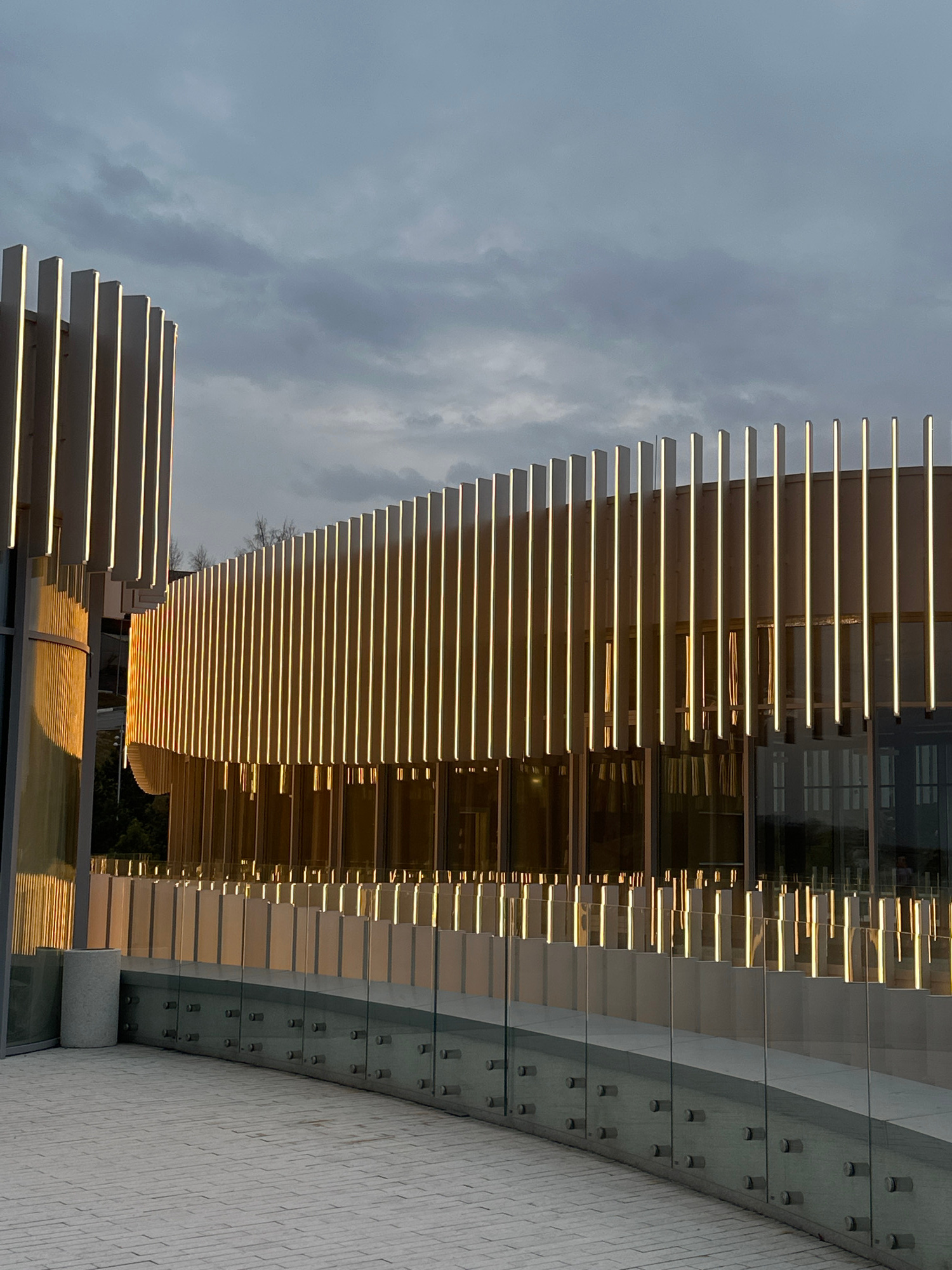The image shows a section of modern architecture, likely a building in the city of Kazan, Russia. The building features a facade with horizontal illuminated slats, creating a layered effect. A glass a…read more