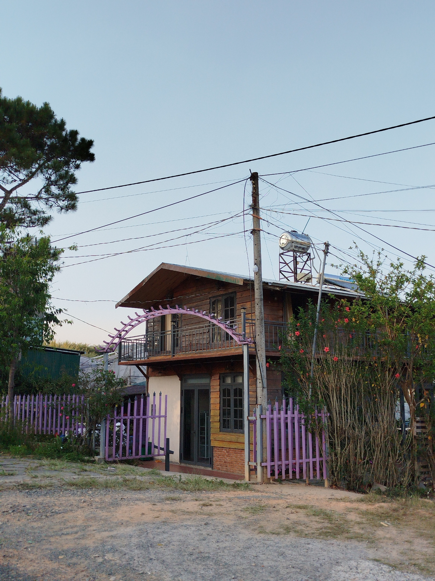 A two-story building stands in Da Lat, Vietnam. The building's upper story is wood paneling; the lower story is painted white and has a brick section. A purple fence surrounds the yard. A solar water…read more