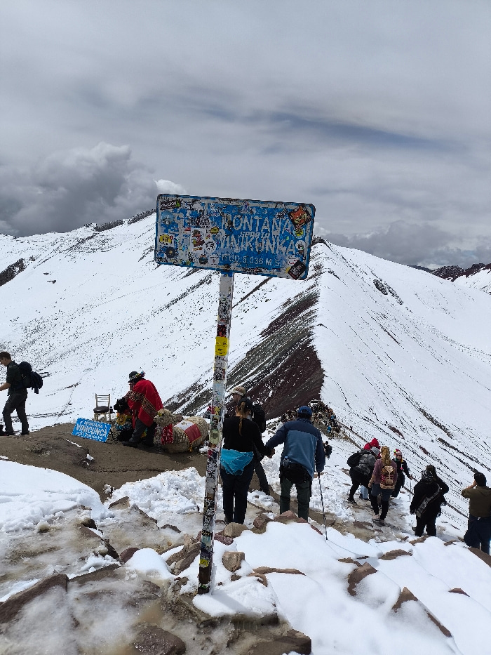 A snow-covered mountain landscape features a blue sign that reads "MONTANA SOUTH VINIKUNKA" with an altitude measurement. Several people are gathered on a rocky outcrop near the sign. Some are dressedβ¦read more