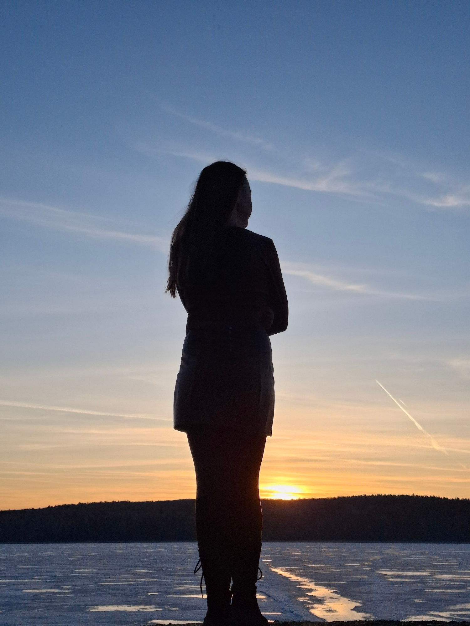 The image captures a solitary figure silhouetted against a dramatic sunset over a body of water, likely in Chaikovsky, Russia. The person, appearing to be a woman with long hair, stands facing the hor…read more
