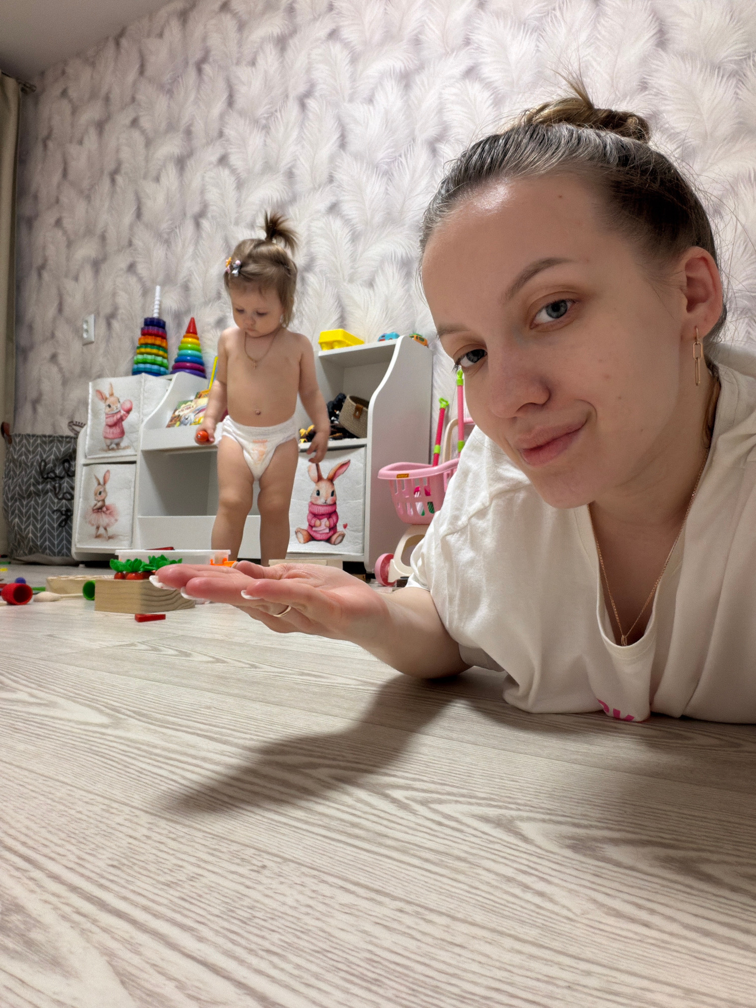 A woman and a young child are the subjects of this photograph, which appears to have been taken indoors. The woman is lying on a wooden floor, and her face is prominently displayed in the upper left c…read more