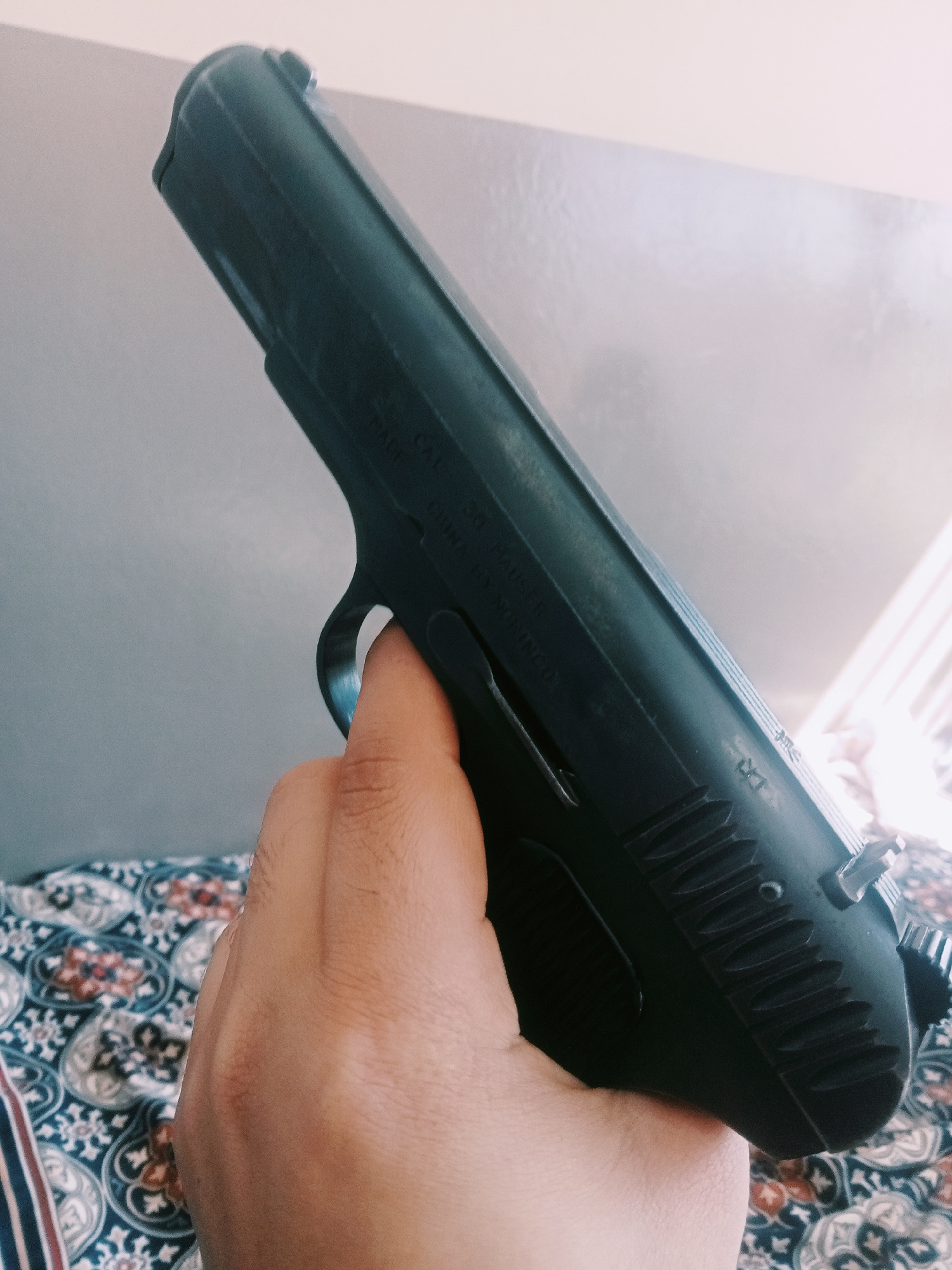 A close-up photograph depicts a right human hand holding a dark-colored semi-automatic pistol in an indoor setting. The hand, with visible hair on the knuckles, firmly grips the pistol, and the index…read more