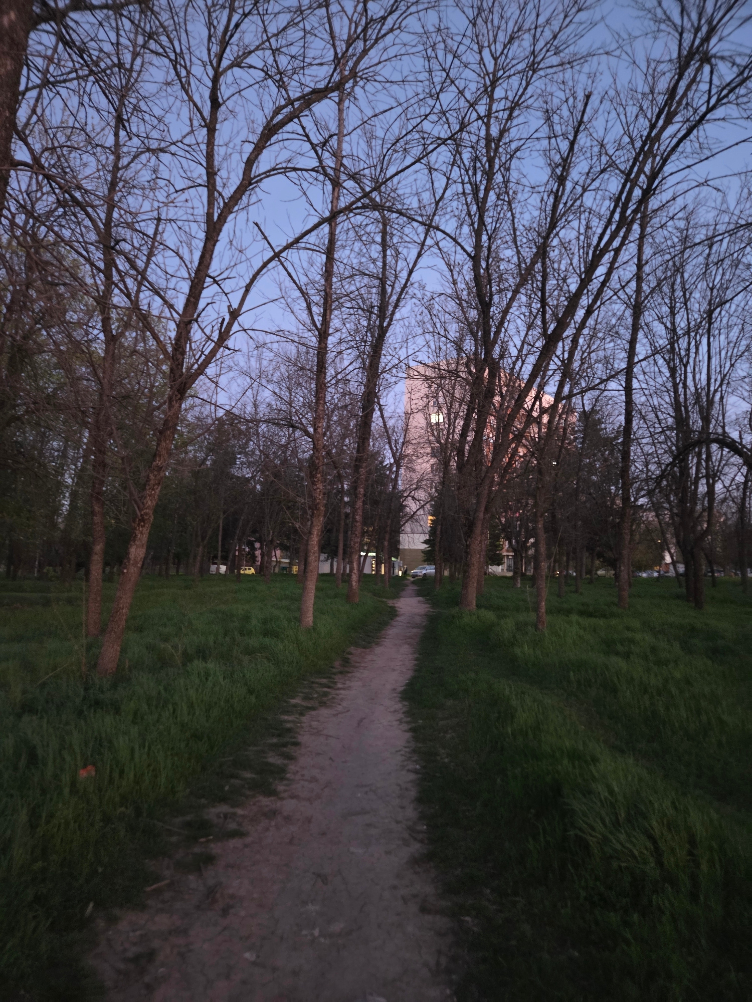 The image shows a pathway lined with trees in a park in Pleven, Bulgaria, at dusk. The path is made of dirt and gravel and runs between grassy areas. The trees are bare, with only branches visible aga…read more