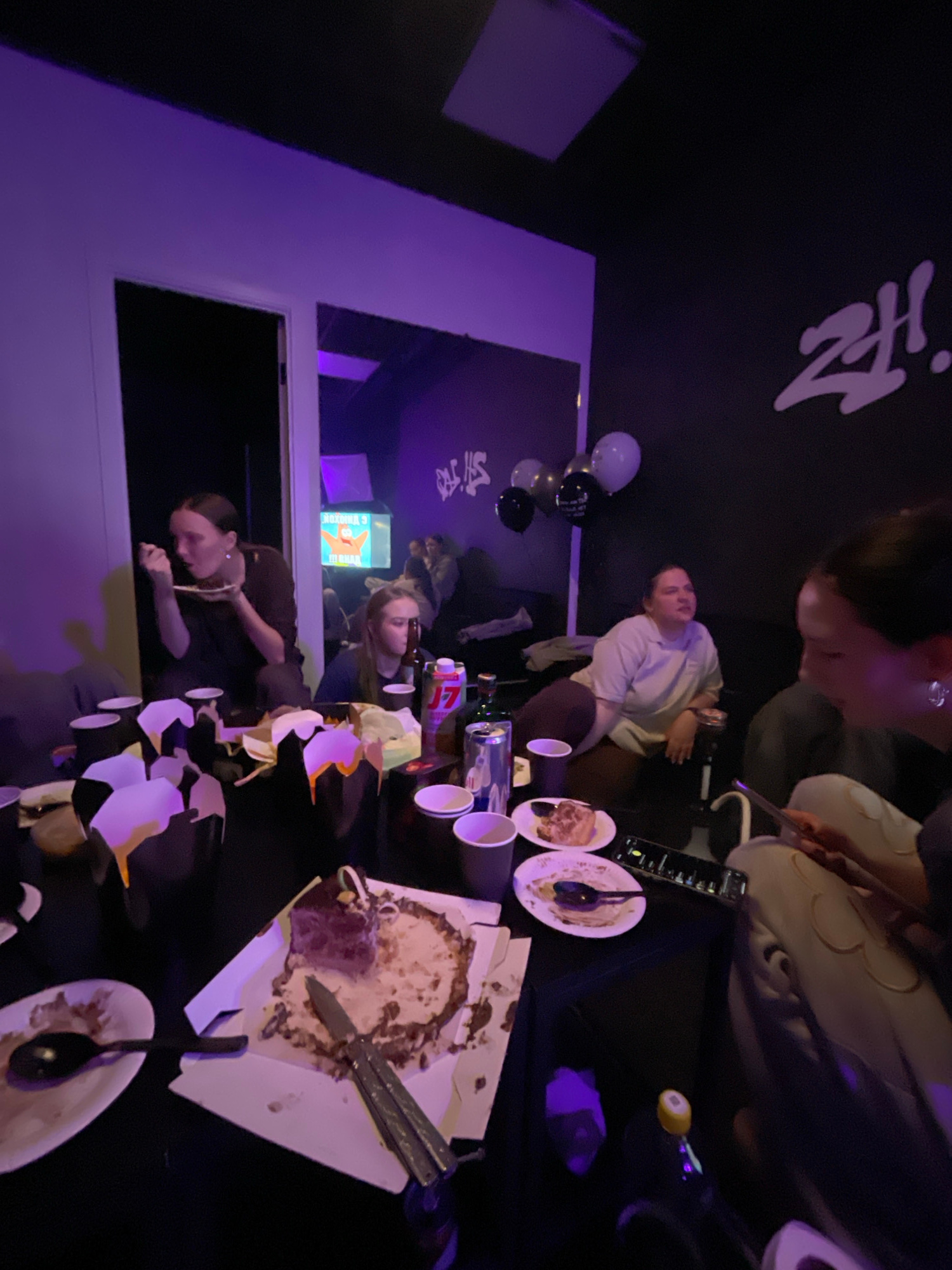 The image depicts an indoor event, likely a party or celebration, with several people present around a table laden with food and remnants of a cake. The setting appears to be a room in the city of Kra…read more
