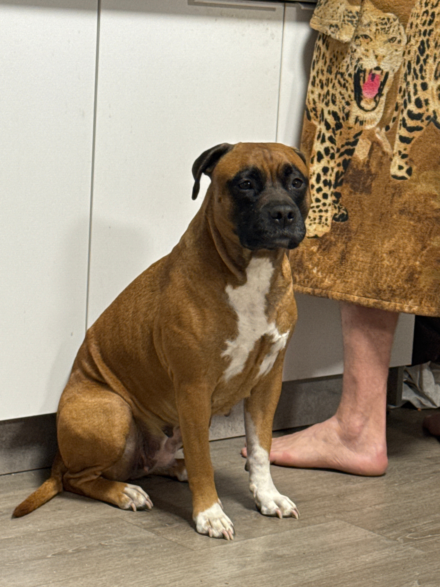 A tan and white Boxer dog is lying on a light-colored wooden floor, partially obscured by a leopard-print blanket/cover. A bare human foot is near the dog. The setting appears to be indoors, next to w…read more