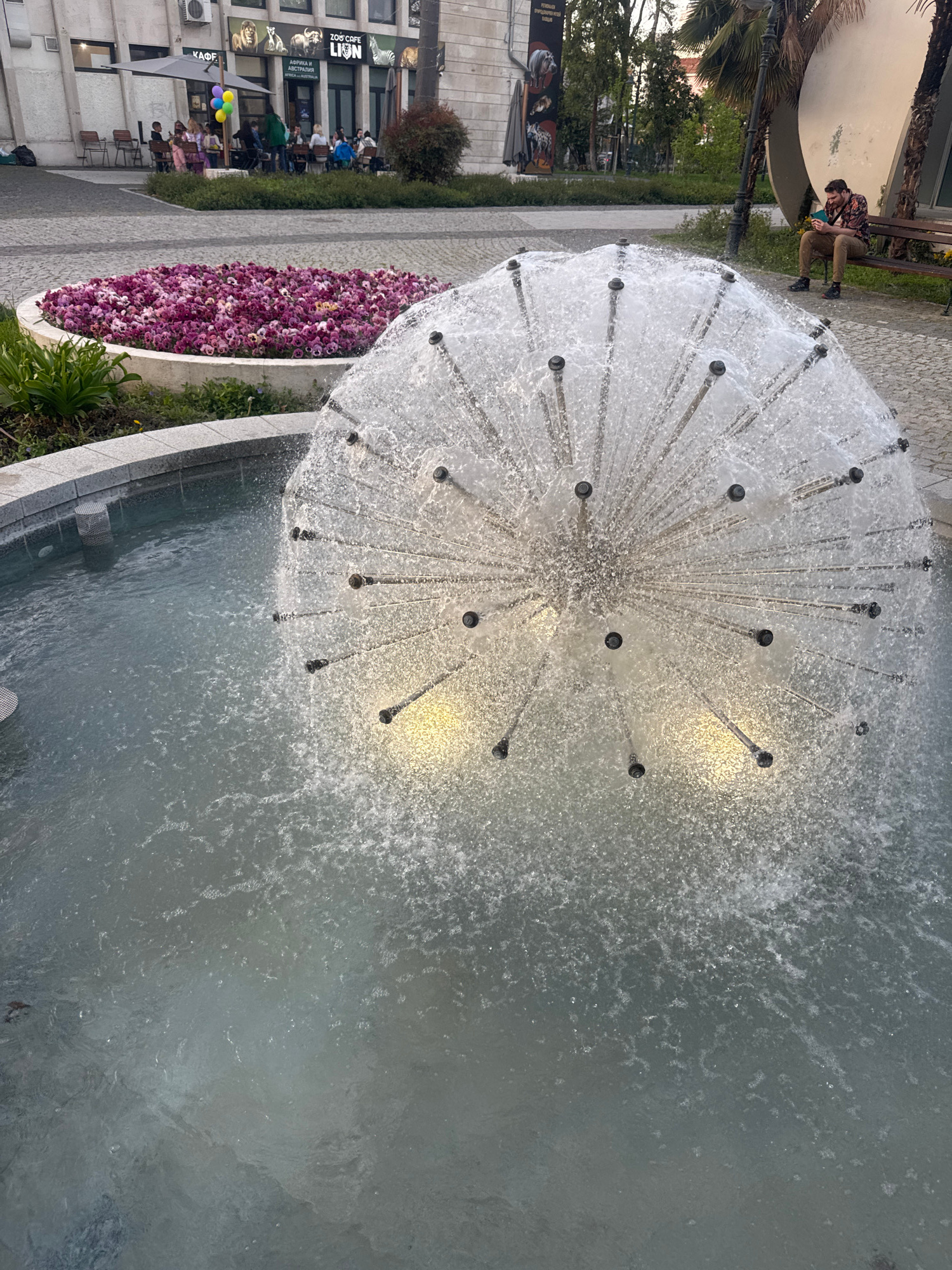 The image depicts a "dandelion" water fountain in Plovdiv, Bulgaria. The fountain, central to the frame, features multiple nozzles spraying water outwards, creating a spherical shape. The water collec…read more