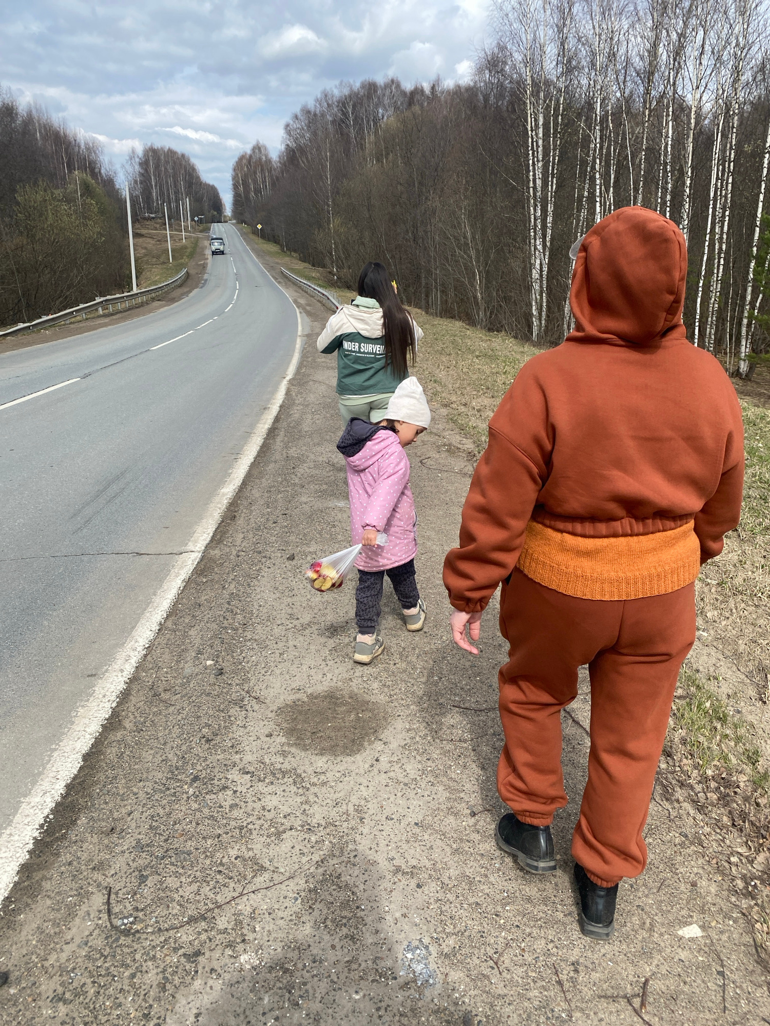 An outdoor scene captures three individuals standing on the gravel shoulder of a paved road, adjacent to a forest primarily composed of bare deciduous trees, including some birches. The sky is overcas…read more