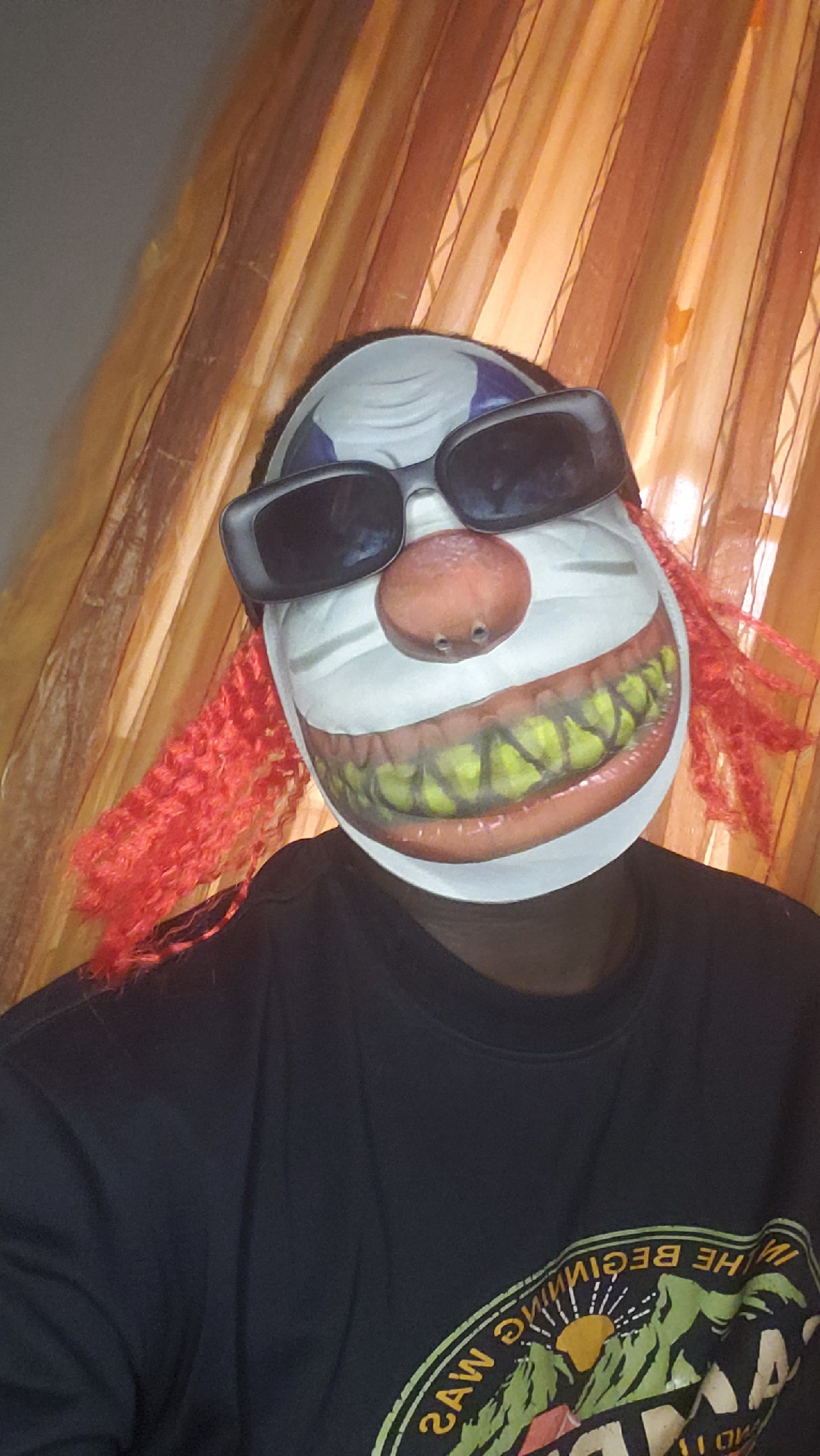 A clown mask with black sunglasses and orange hair sits on a striped surface next to a person wearing a black shirt with a graphic design. The location is not identified in the image, but the user ask…read more