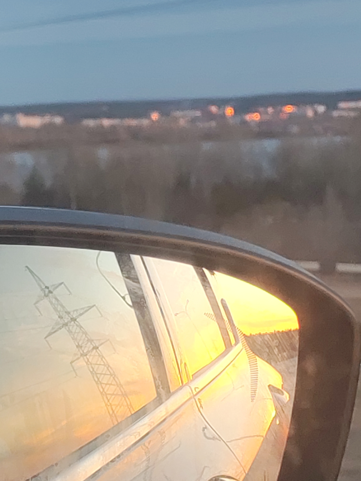 The image shows a car side mirror reflecting a sunset with an electrical tower in the foreground. The background is a blurry cityscape with lights visible, suggesting the city of Chaikovsky, Russia, dā¦read more