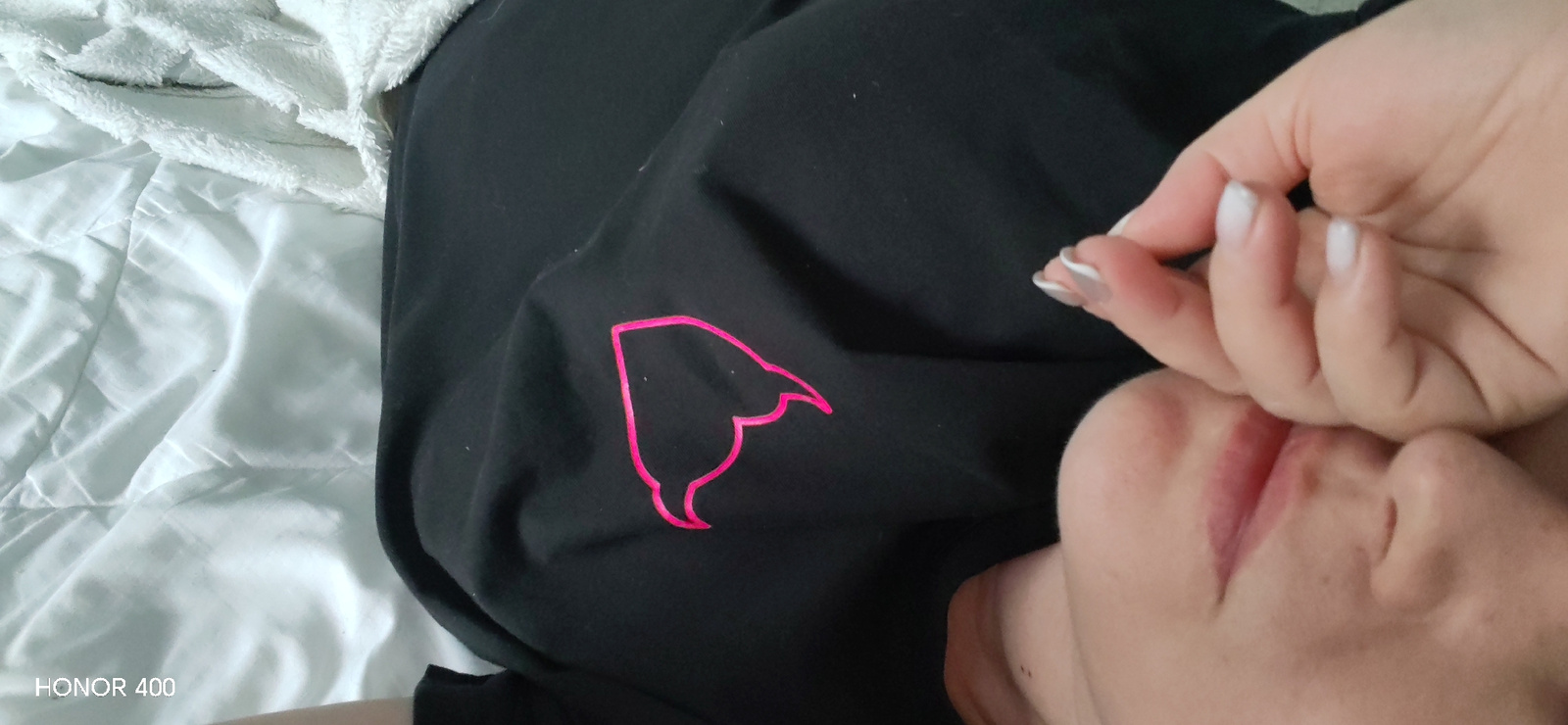 The image shows a person lying on a white bed. They are wearing a black garment with a pink design. Their hand is near their face. The scene does not reveal the city of Noviy, Russia.