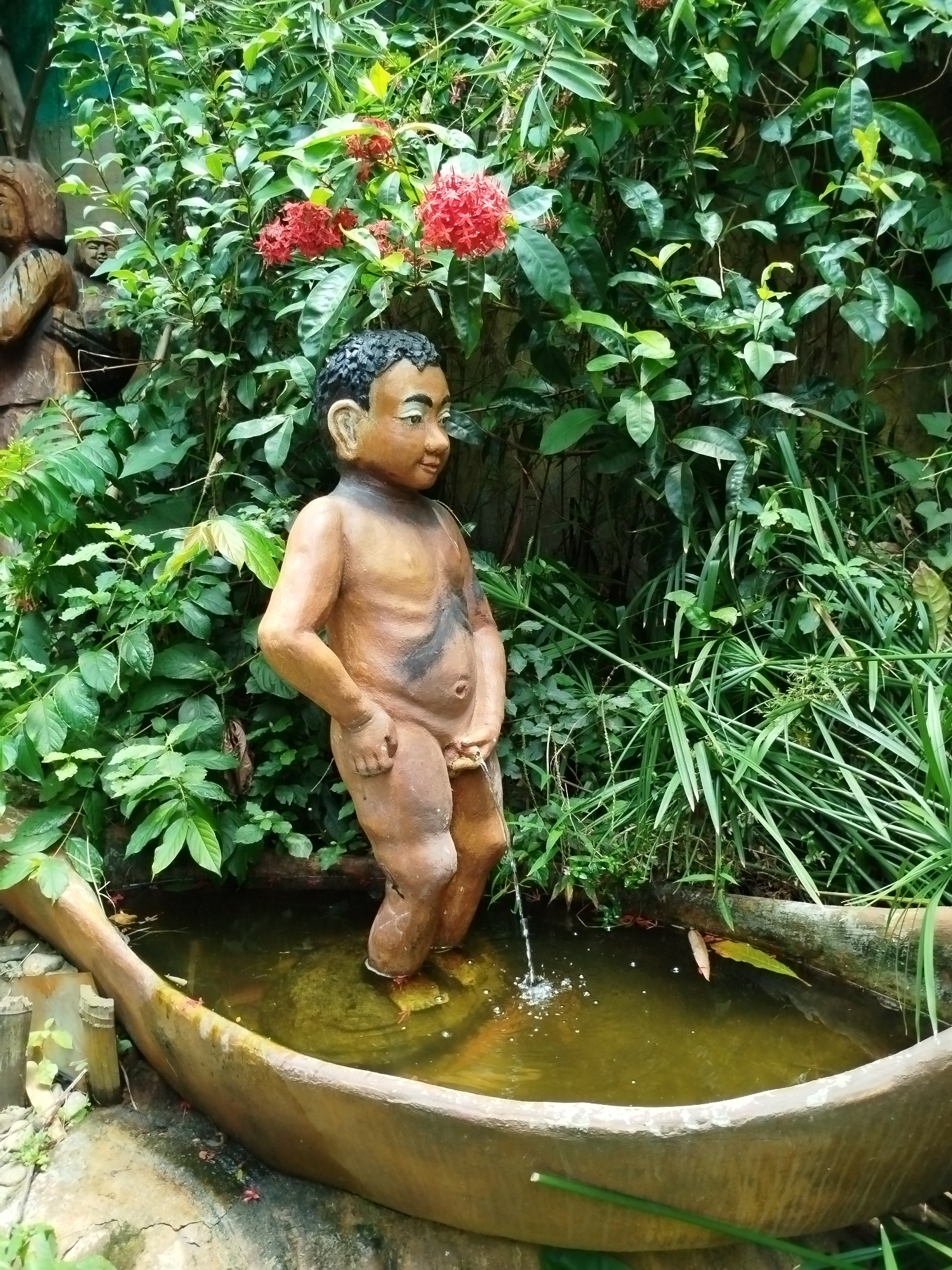 The image captures a garden scene featuring a fountain designed as a statue of a young boy. The statue, likely made of carved wood or a similar material with painted details, depicts a dark-skinned bo…read more