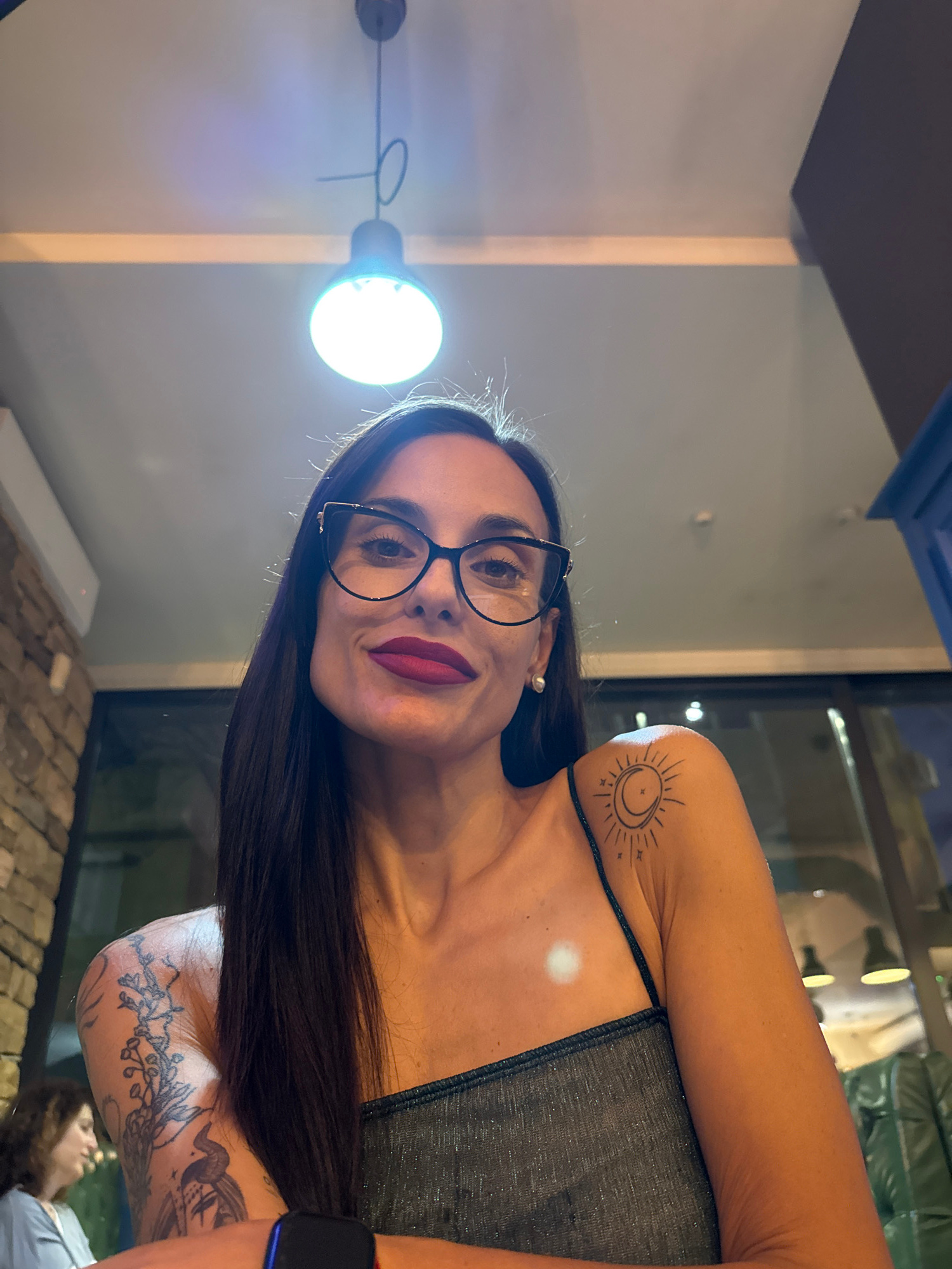 A medium shot depicts a woman with long, dark hair and glasses, wearing a gray top. She has tattoos on her upper left arm, including one of a sun and moon symbol. The background suggests an indoor set…read more