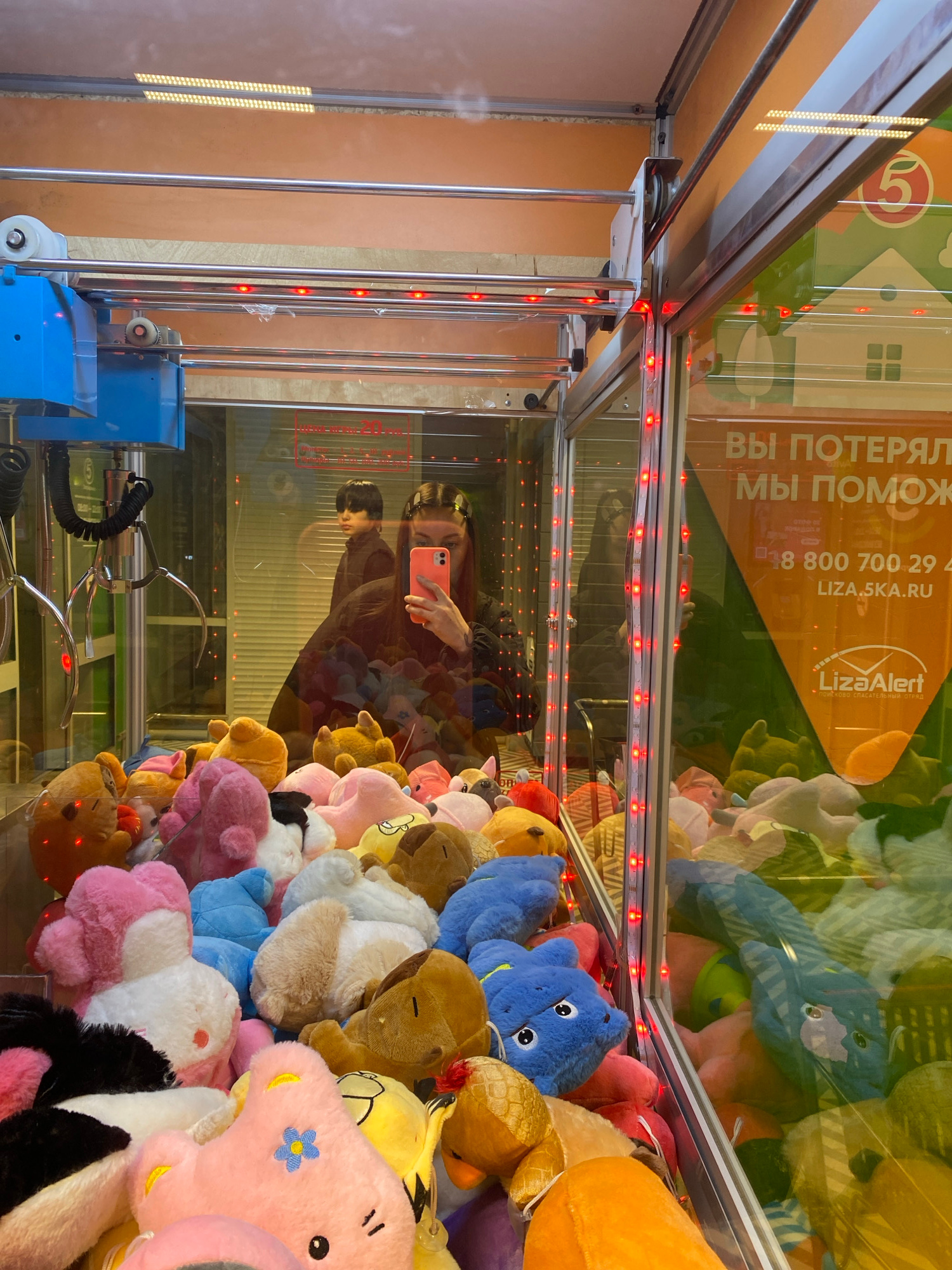 The image depicts the inside of a claw machine, presumably in Votkinsk, Russia. The machine is filled with stuffed animals of various colors and shapes. A person, likely taking the photo, is reflected…read more