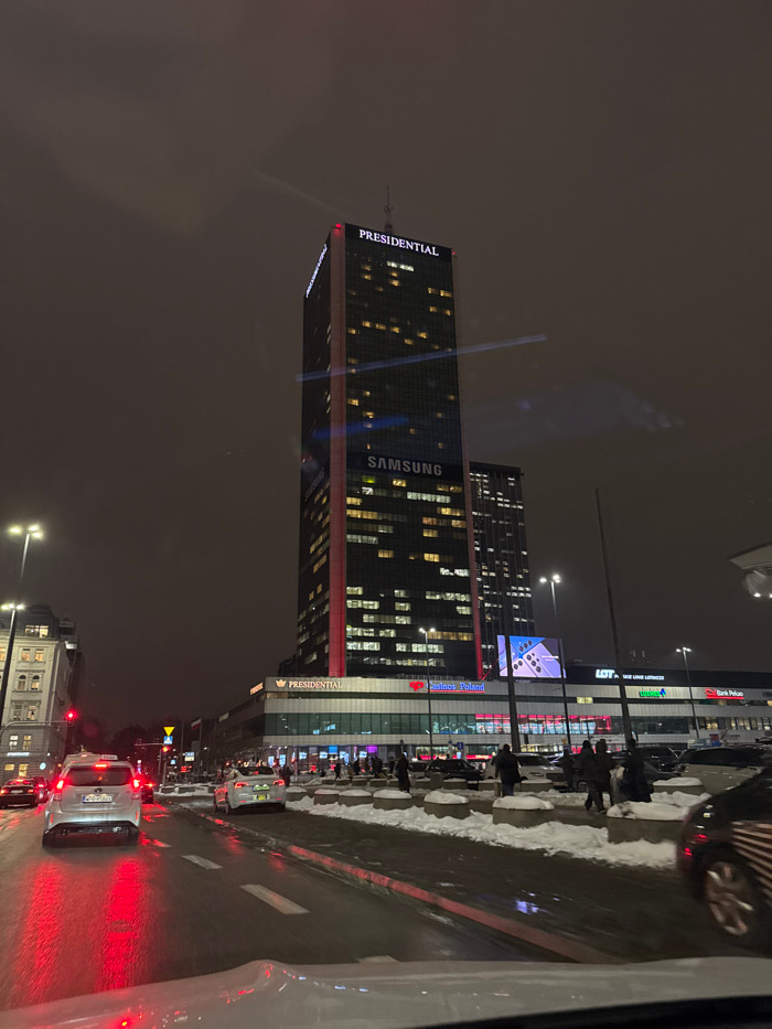 The image depicts a nighttime urban scene in Warsaw, Poland, focused on the Warsaw Trade Tower located at ul. Chłodna 51. The prominent skyscraper, a tall, dark glass structure, is illuminated with in…read more