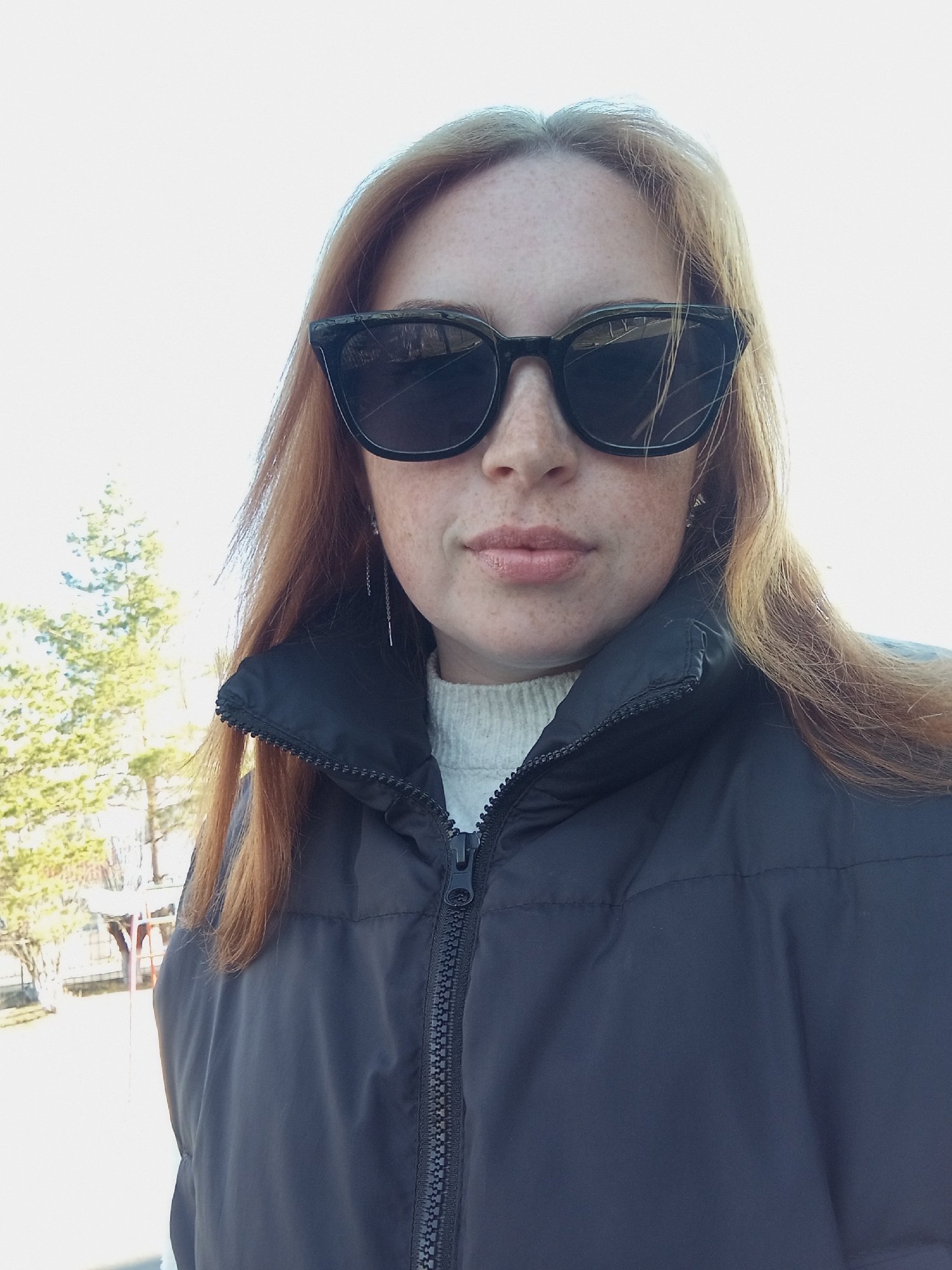 A woman with red hair and freckles is wearing sunglasses and a black puffer jacket with a white sweater underneath. The photo appears to be taken outdoors in Yurgamysh, Russia, indicated by the locatiβ¦read more