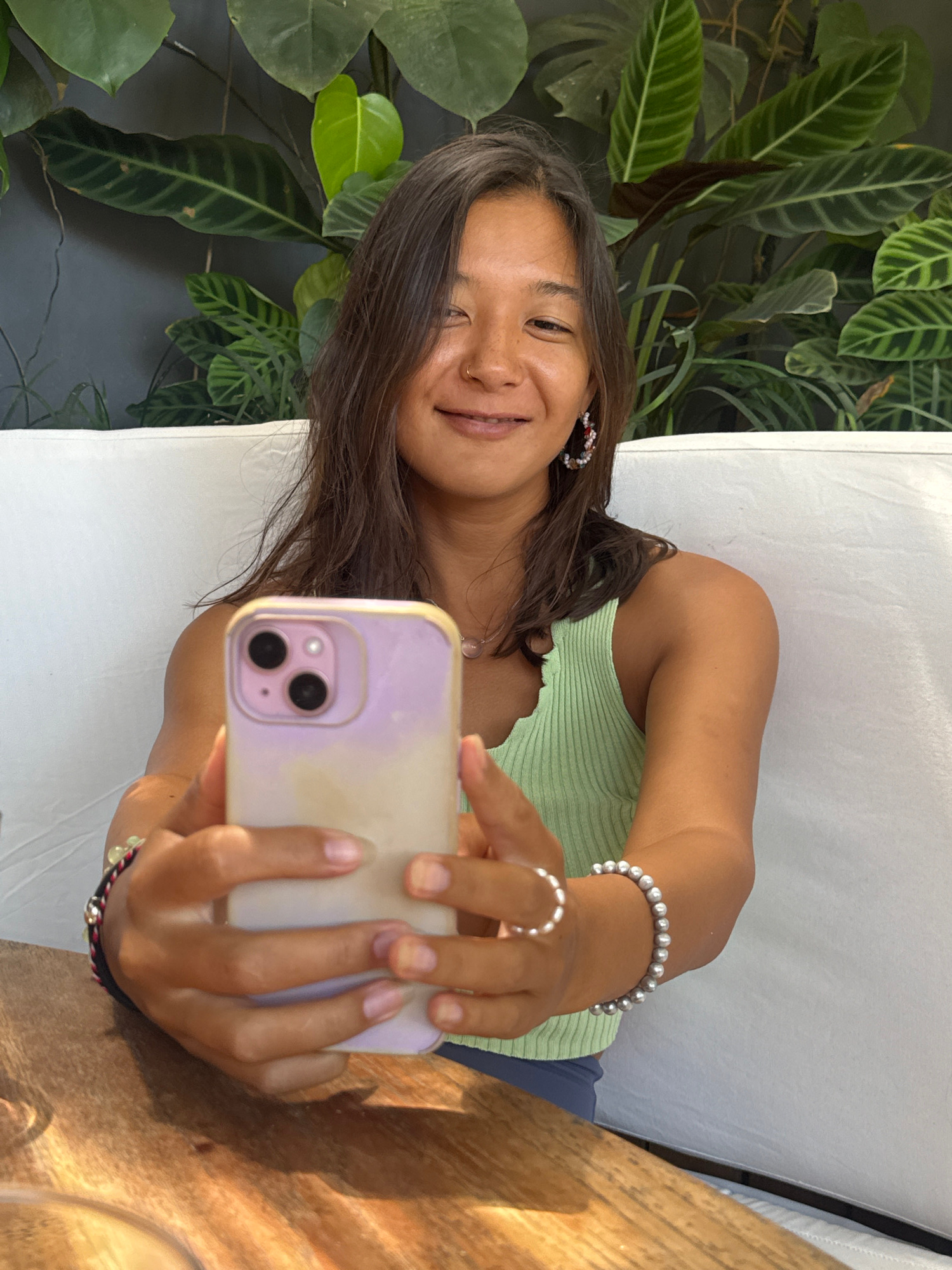 A young woman is captured in a vertical selfie, smiling warmly at the camera. She has long, dark hair, and wears a light green ribbed tank top. Her accessories include beaded hoop earrings, a nose rin…read more