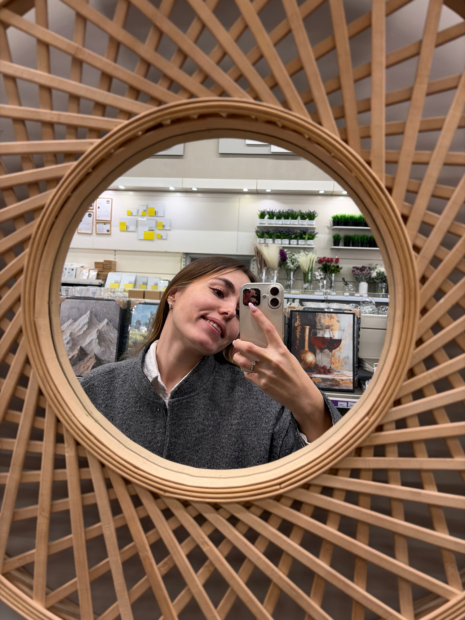 A person is taking a selfie in a round mirror with a light brown wooden frame. The frame has a sunburst design, with wooden slats radiating outwards from the mirror. The person is holding a smartphone…read more