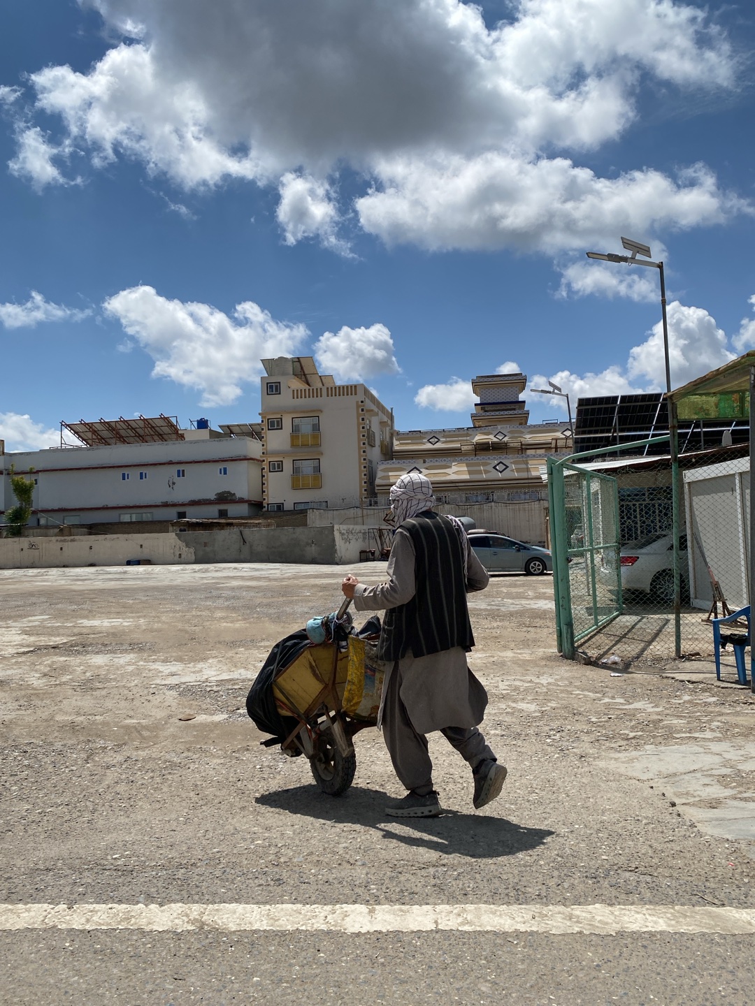 A man pulls a two-wheeled cart across a rough concrete surface in Kandahar, Afghanistan. The man wears a traditional headscarf, a grey tunic and trousers, and a black striped vest. The cart is loaded…read more