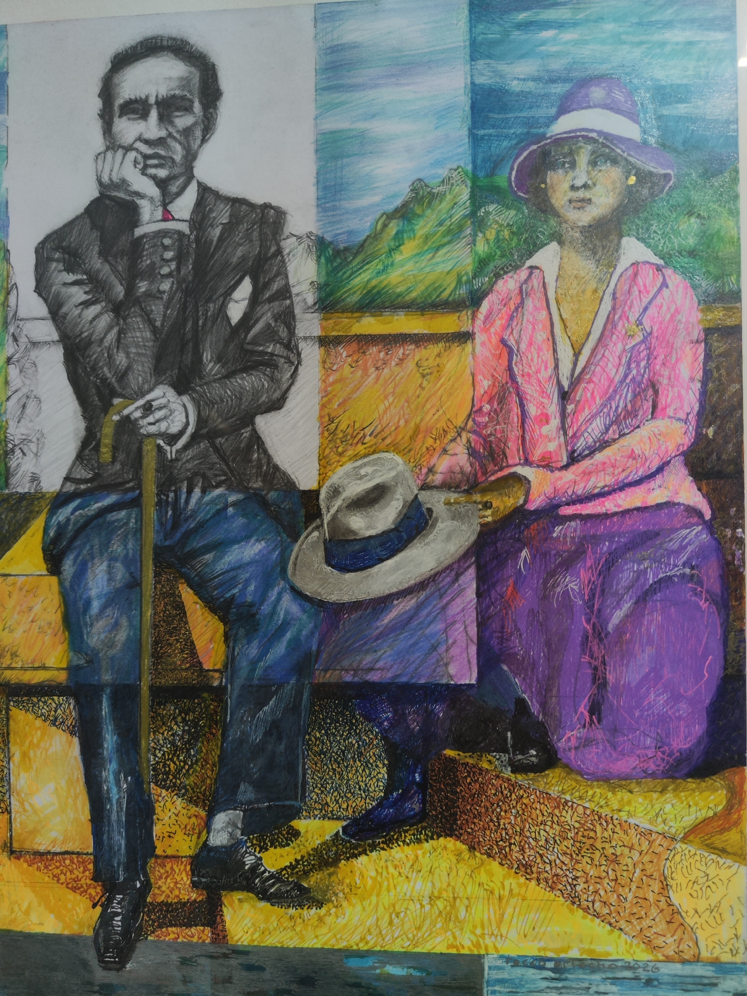 The image depicts a drawing of a man and woman sitting side by side on a bench. The man is on the left, drawn primarily in grayscale, wearing a suit and holding a cane, with his hand on his chin in a…read more