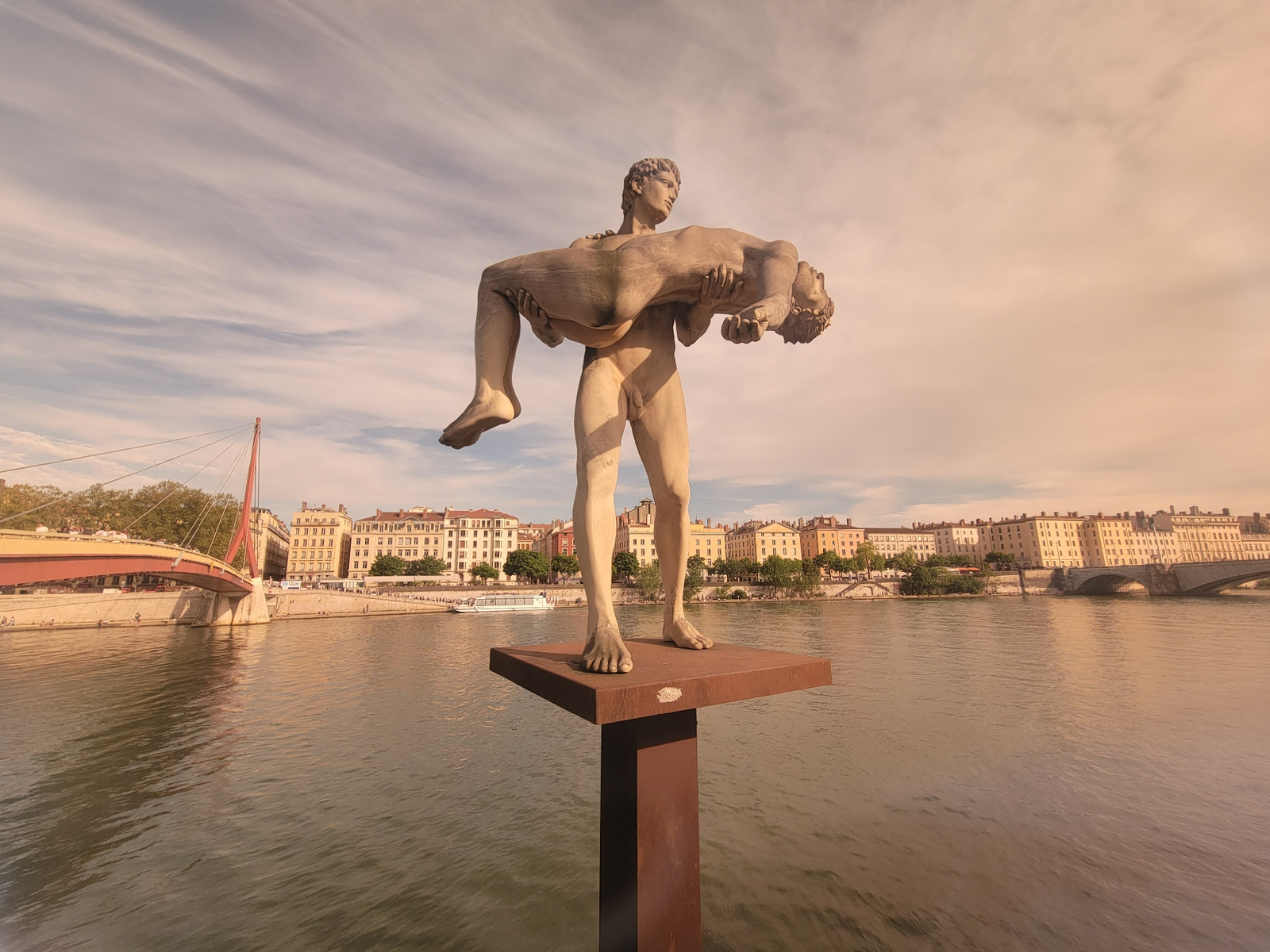 A statue depicting a man carrying another man is positioned in the Saône River in Lyon, France. The statue is mounted on a square platform atop a tall, rectangular pillar. The backdrop includes buildi…read more