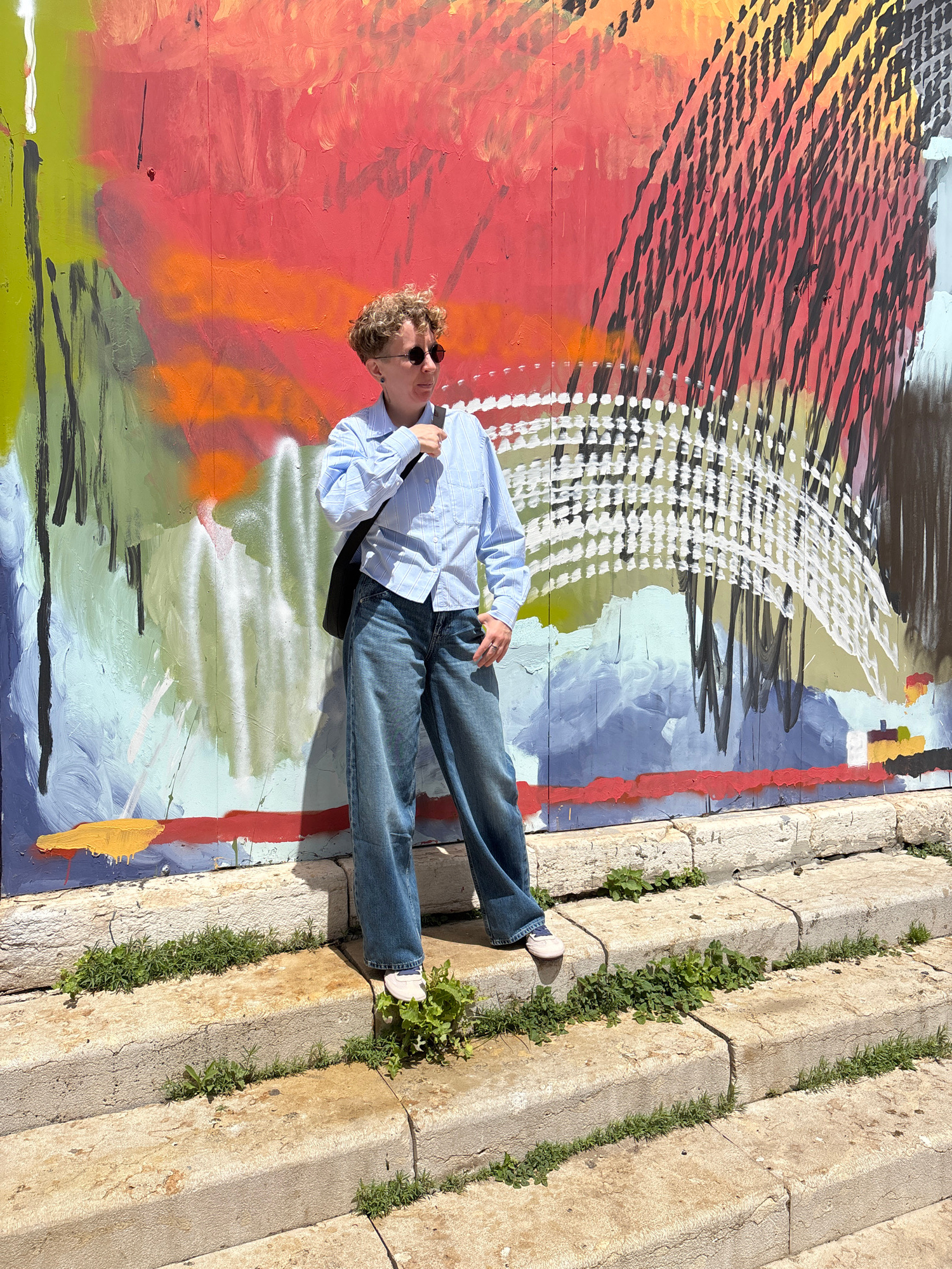 A person with curly hair and sunglasses is lying on their back against a colorful graffiti wall next to concrete steps with some greenery growing between the steps. The person is wearing a light blue…read more