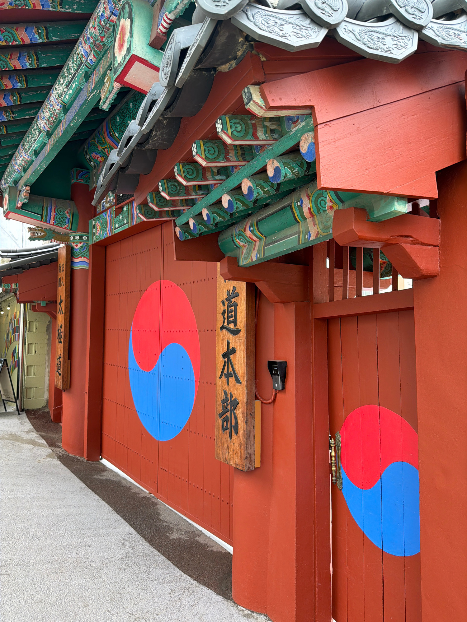 The image shows the eaves and underside of a traditional Korean building, likely a temple or historic structure, possibly in Busan, South Korea, given the cultural elements. The architecture features…read more