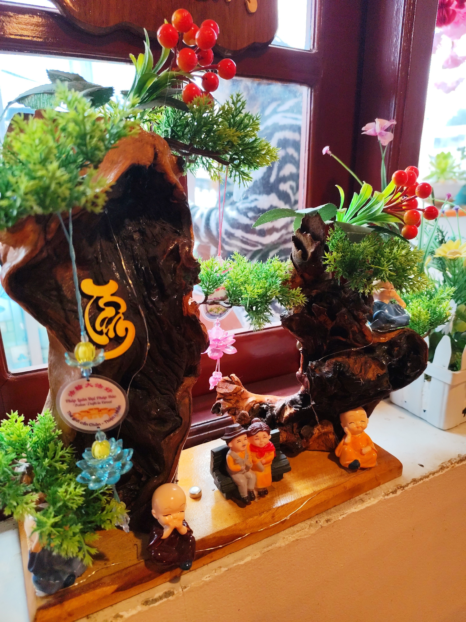 A still life arrangement on a window sill in Da Lat, Vietnam features two gnarled, dark brown wooden pieces decorated with artificial greenery, red berries, and small figurines. The wooden pieces are…read more