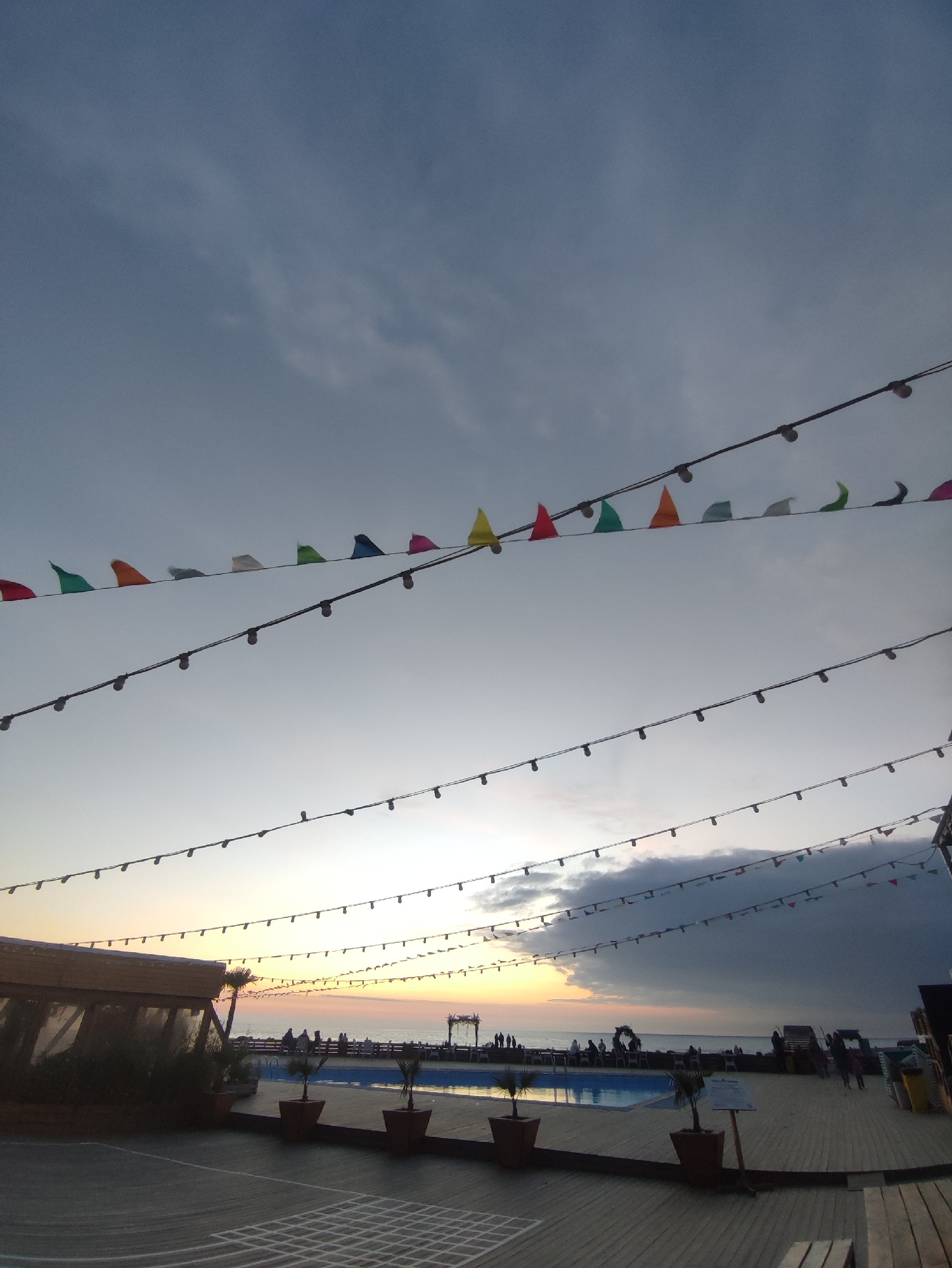 The image depicts a sunset scene in what appears to be a recreational or event area in Sirius, Russia. The foreground features a wooden deck with a painted grid pattern, potted plants, and the corner…read more