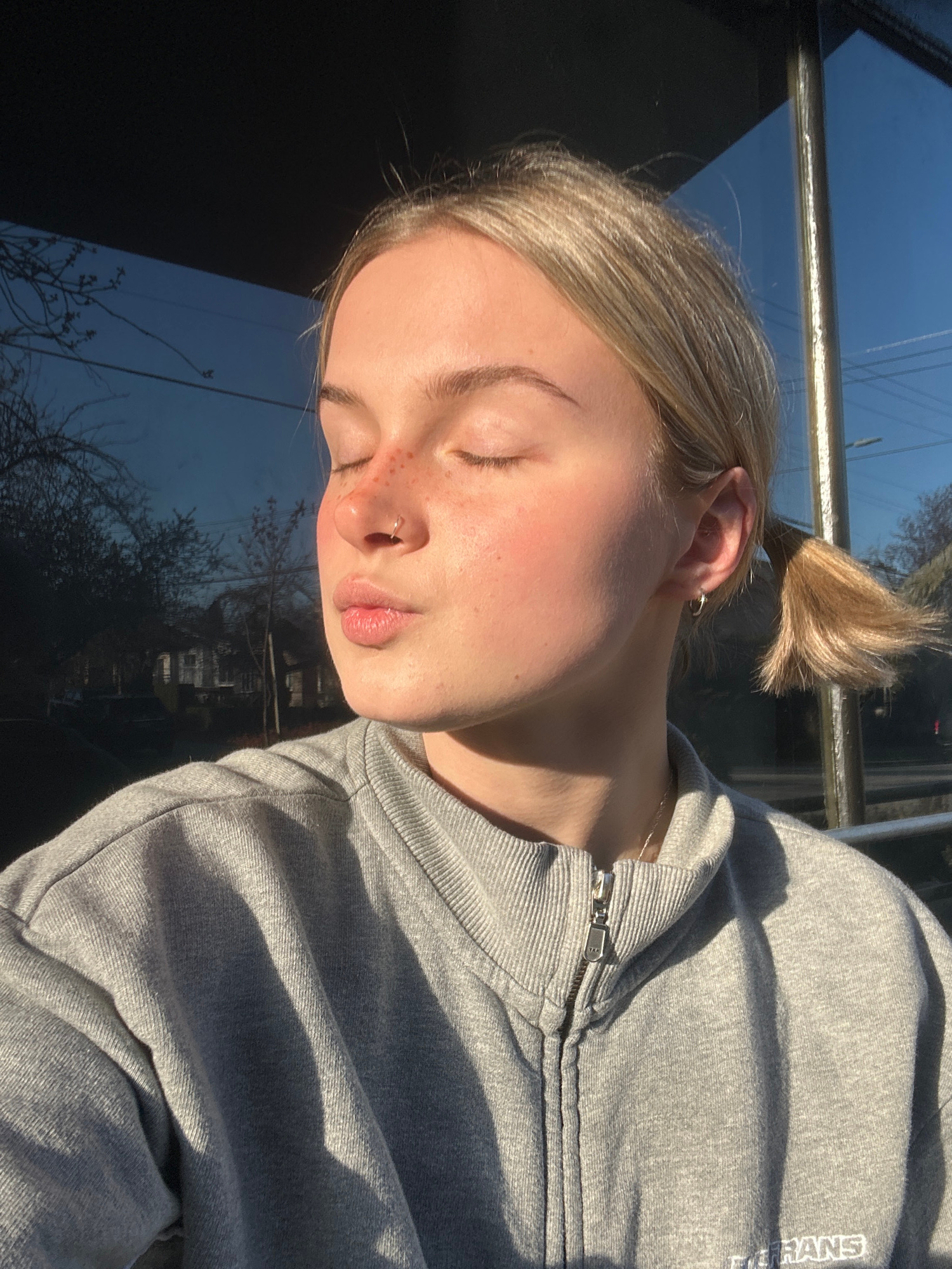 A young woman with fair skin, freckles, and light-blonde hair pulled back in a short ponytail sits in front of a window. Her eyes are closed. She wears a grey zip-up sweatshirt. The window behind herβ¦read more