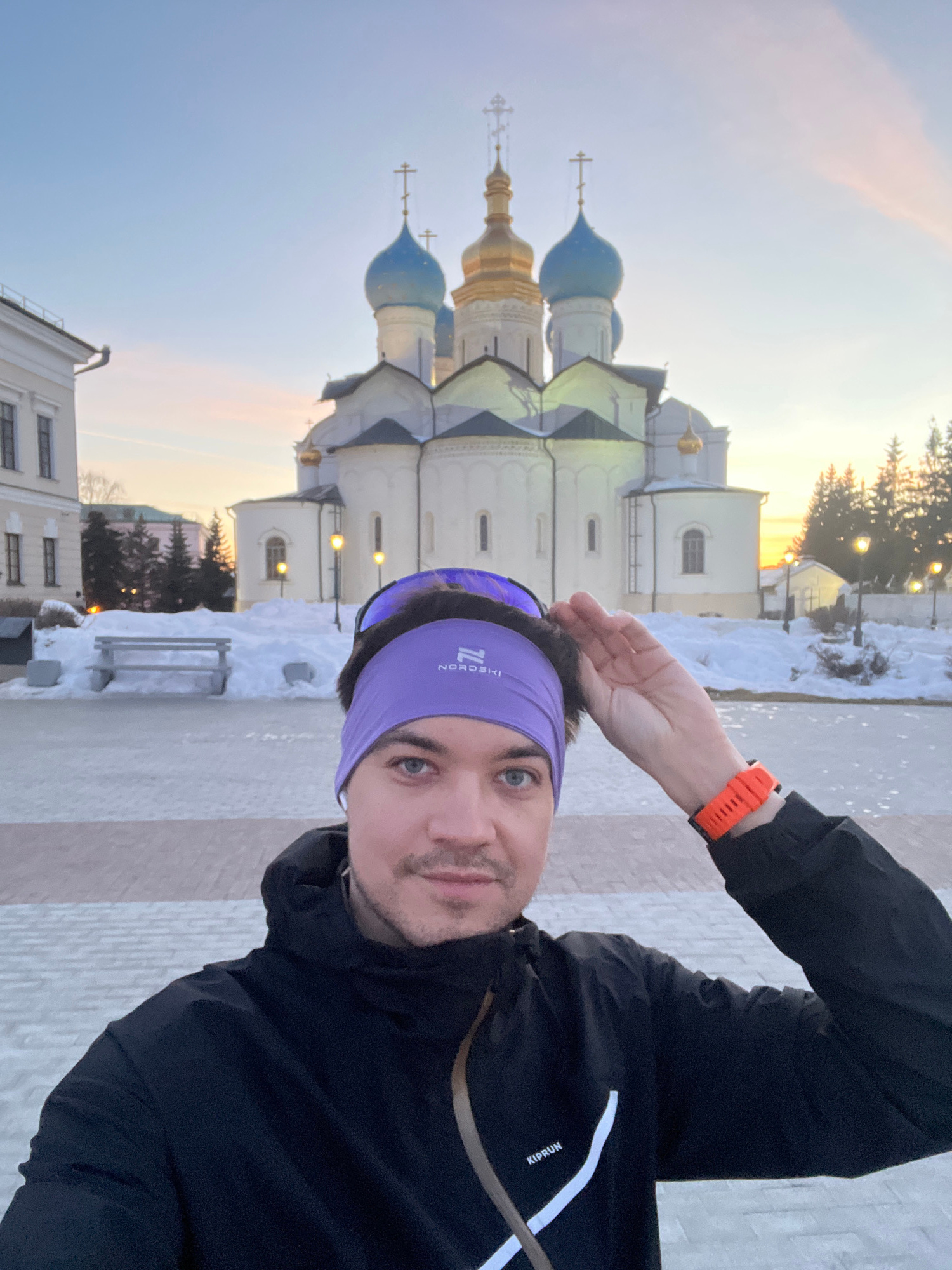 A male individual is depicted in a selfie-style shot in front of the Annunciation Cathedral (Blagoveshchensky Sobor) within the Kazan Kremlin, Kazan, Russia. The man, appearing to be in his 20s or 30s…read more
