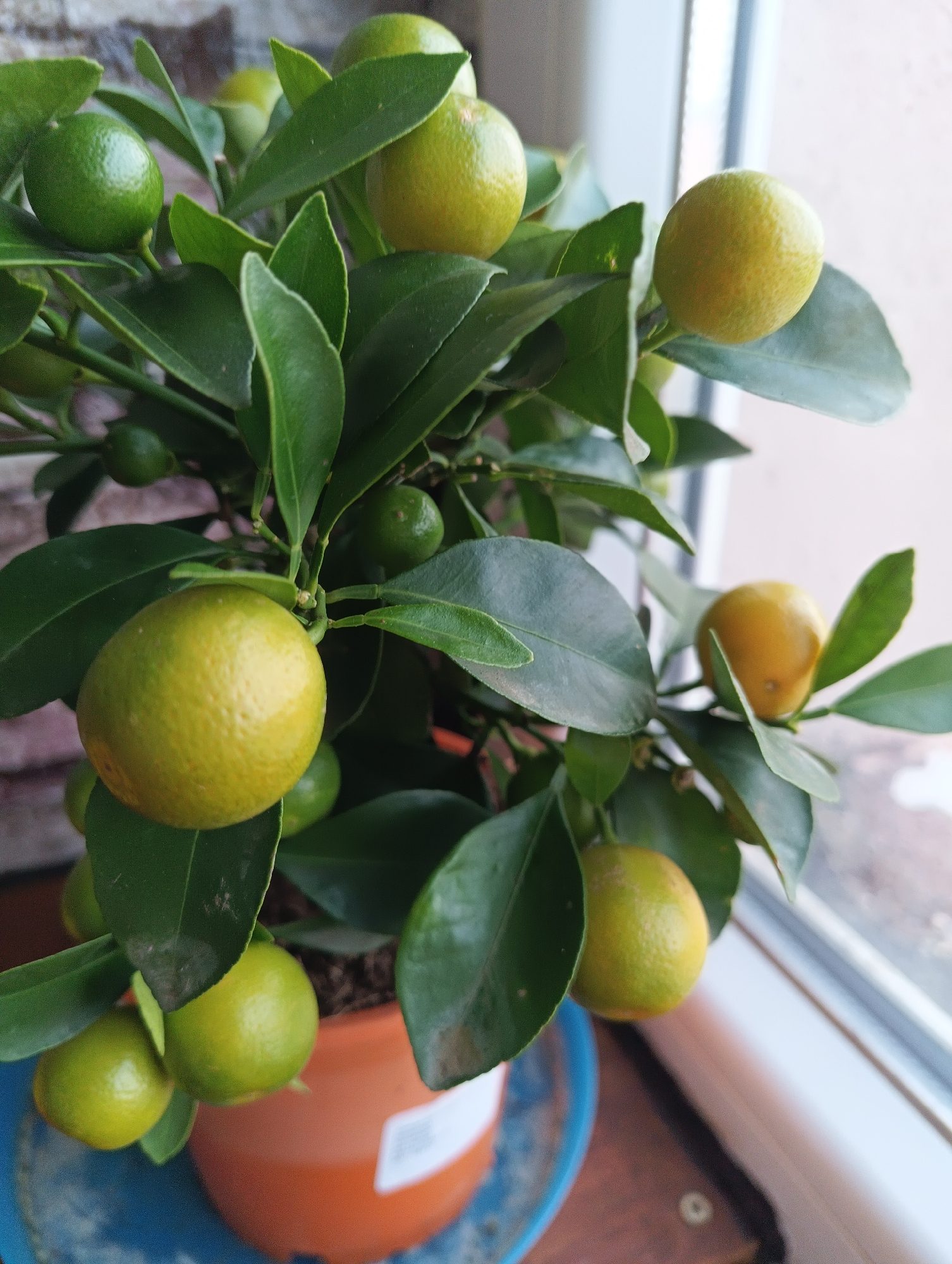 This close-up, eye-level shot captures a vibrant citrus plant, likely a kumquat or calamondin, thriving in a pot indoors in Karnobat, Bulgaria. The main subject is the small tree laden with numerous r…read more