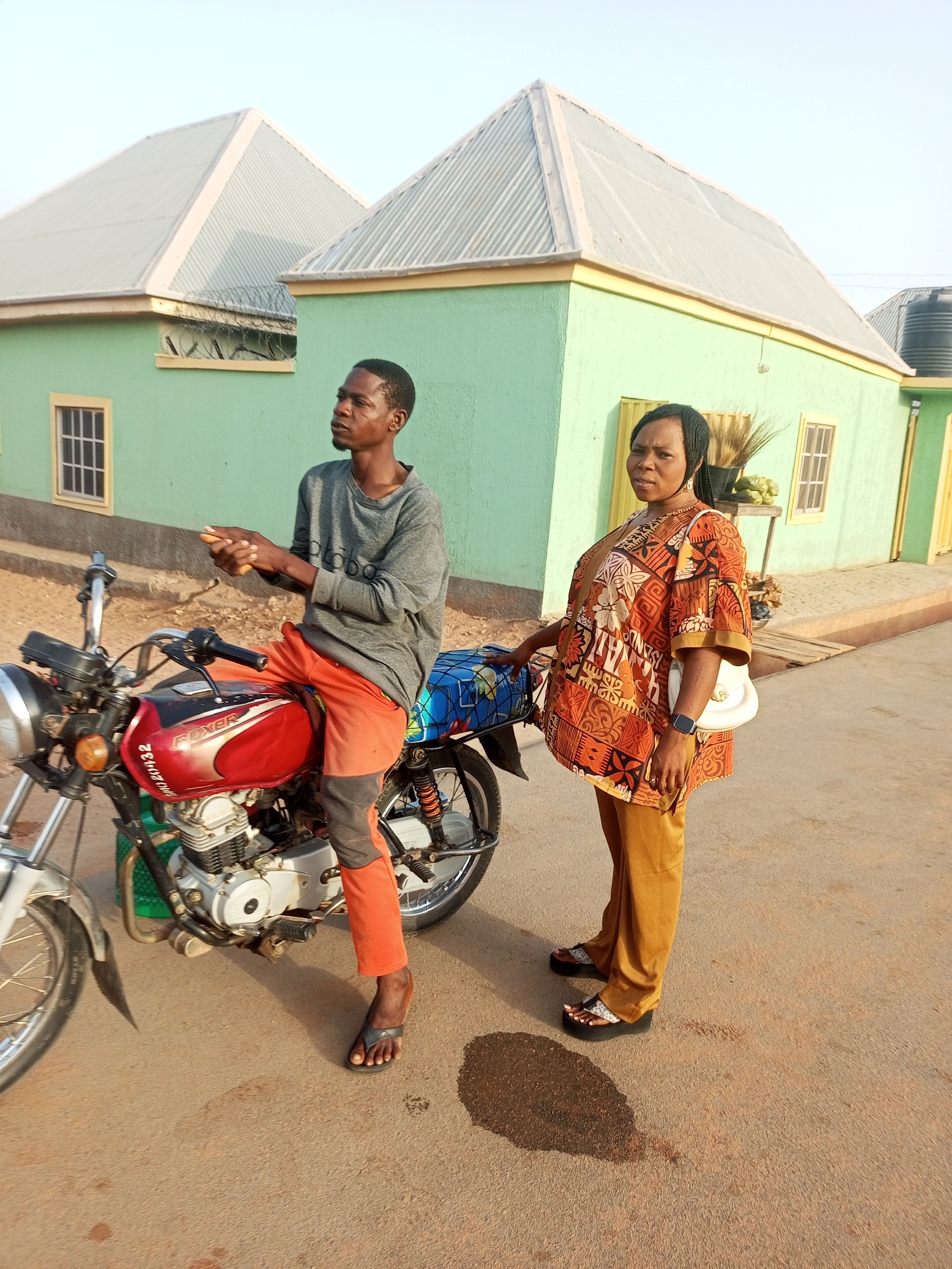 A man on a red "BOXER" motorcycle sits next to a woman outside a light-green building with a light-grey roof, in Timia, Niger. The man wears a grey long-sleeved shirt, orange pants and black sandals.…read more
