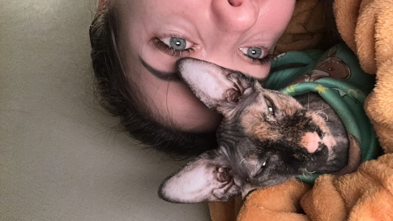 A close-up, downward-angled indoor shot depicts a person's face with their eyes closed, possibly resting or undergoing a beauty treatment. They are wearing a pink and white bunny ear headband. A semi-…read more