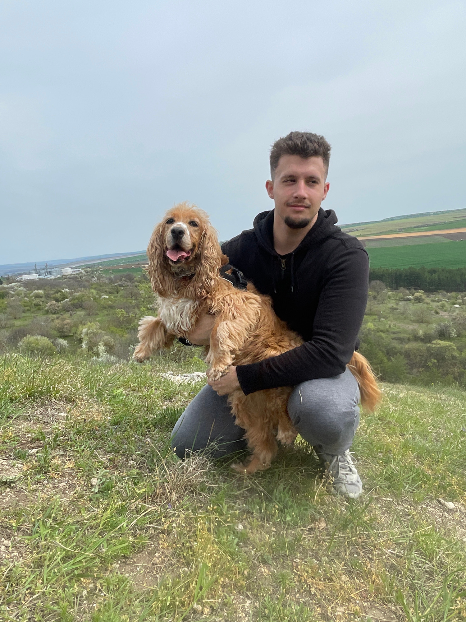 A man and a dog are outdoors in a grassy area. The man is light-skinned with short dark hair and a dark beard. He is wearing a black hoodie and gray jeans. He is squatting or kneeling and holding a me…read more