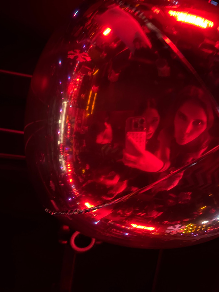 The scene is captured through the reflection on a large, spherical, highly polished or mirrored object, predominantly illuminated by intense red light. Within this distorted reflection, two individual…read more