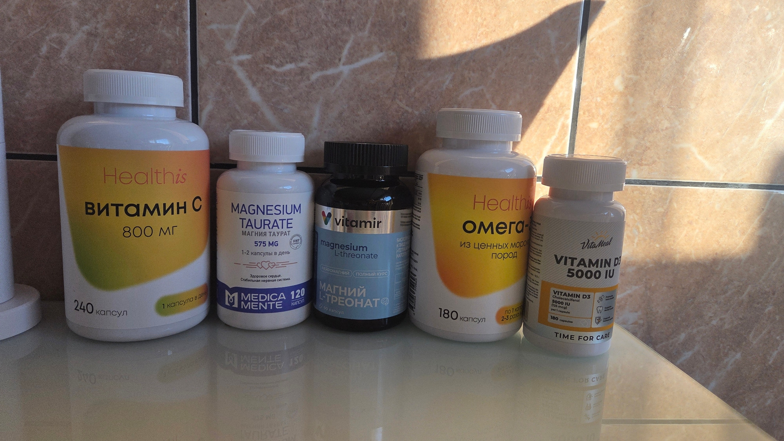 The image shows five bottles of supplements lined up on a glossy surface, likely a countertop or shelf. From left to right, the bottles contain: Healthis Vitamin C 800 mg, Medica Mente Magnesium Taura…read more