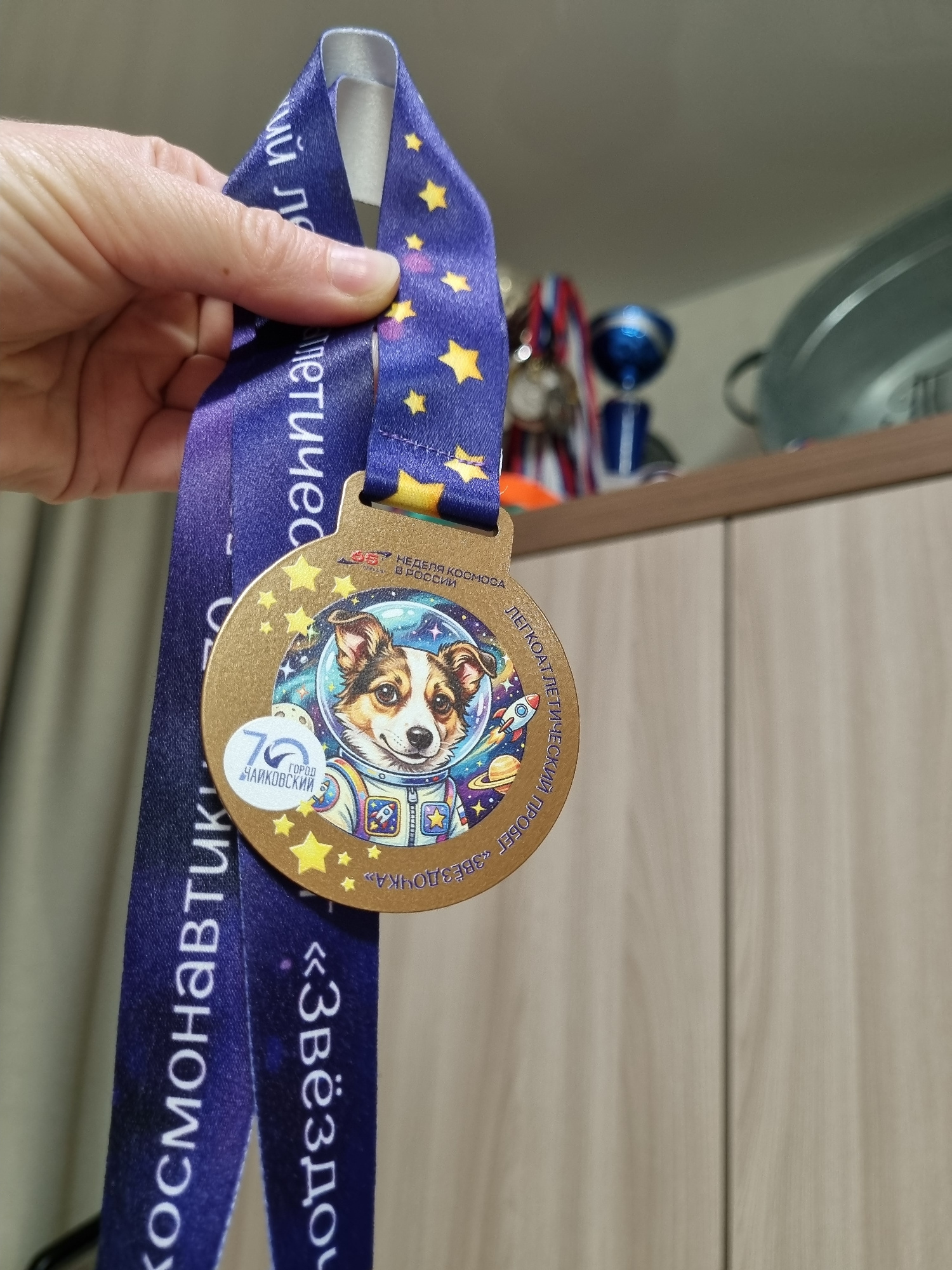 The image shows a medal held by a hand. The medal is golden and features a dog wearing a space suit in the center, surrounded by space-themed decorations. The ribbon attached to the medal is blue with…read more