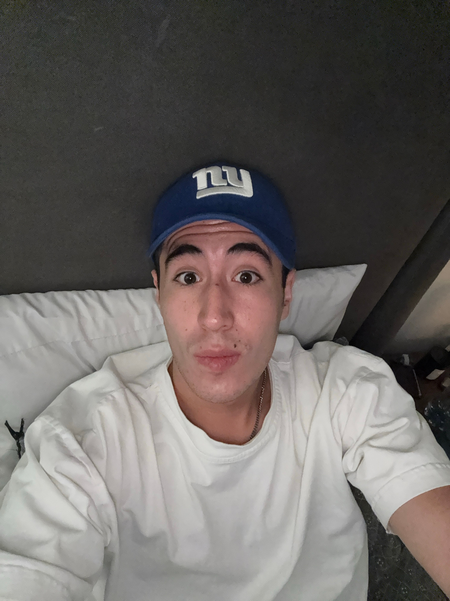 A man lies on a grey couch, propped up by a white pillow. He is wearing a white long-sleeved shirt and a blue baseball cap with a white "NY" logo. A silver chain is visible around his neck. The sceneβ¦read more