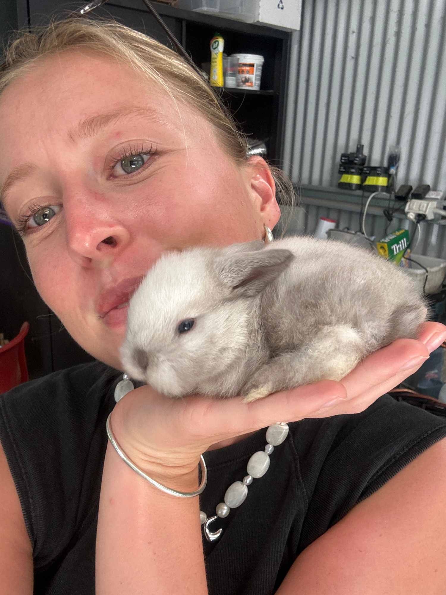 The image portrays an adult female holding a juvenile rabbit in the city of Russell Vale, Australia. The female, with blonde hair, is shown from the chest up, wearing a black sleeveless top, a silver…read more