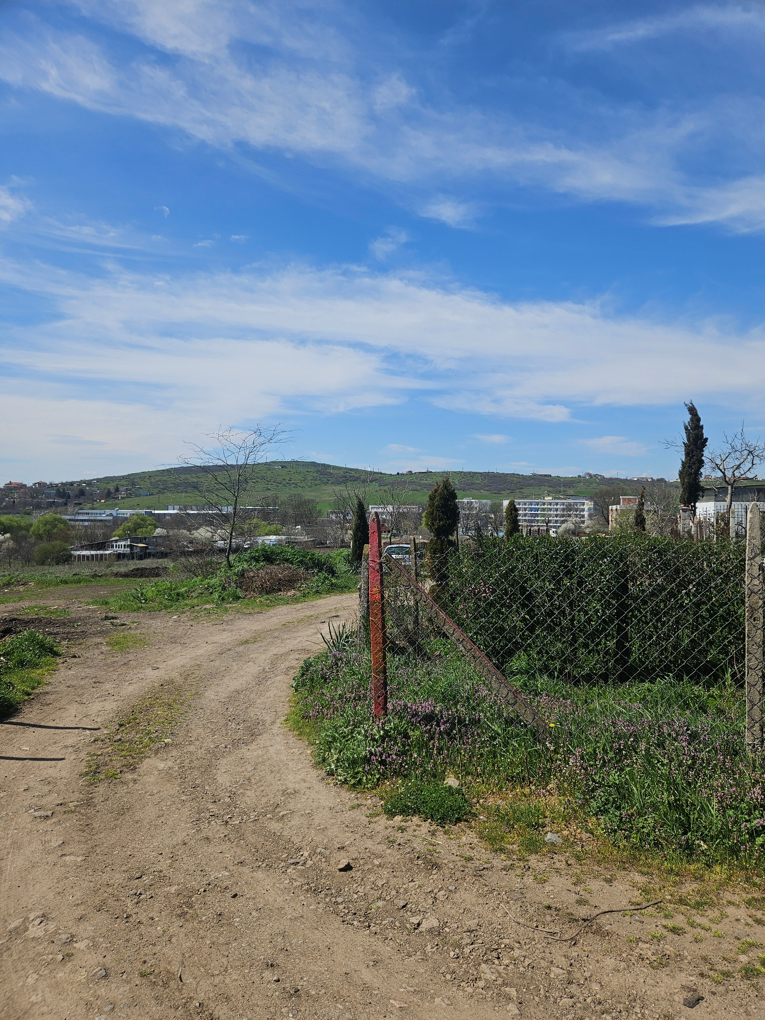 This is an outdoor scene in Burgas, Bulgaria. The view looks toward the west over gently rolling terrain. A dirt road runs diagonally from the lower right to the upper left of the image, curving sligh…read more